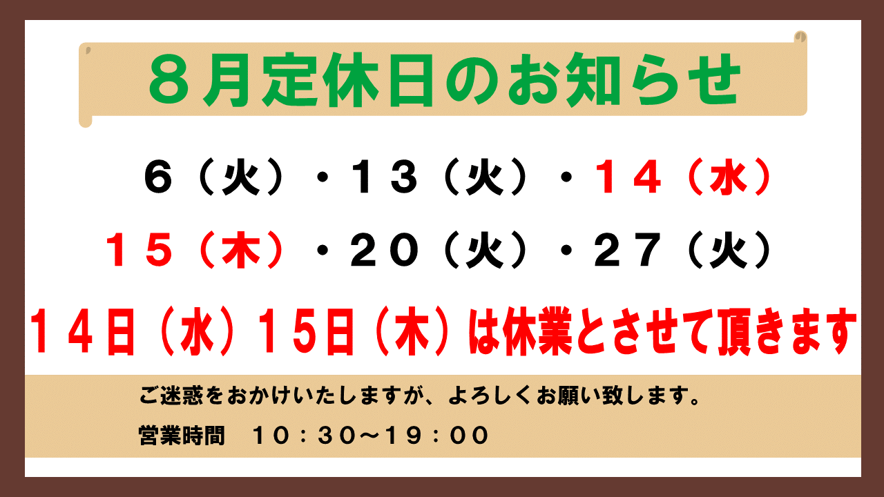 8月 営業日のお知らせ ポスト 2019年8月2日 いつもタイヤ館 栗東HPをご覧下さいましてありがとうございます! 8月の営業日はご覧の通りとなります (*^▽^*) 火曜日 定休日 に加えて ★ 8月14日 (水)・8月15日 (木) は 夏季休暇 となります ★ ご迷惑おかけ致しますがご了承のほどお願い申し上げます。 今月もタイヤ館 栗東をよろしくお願い致します!