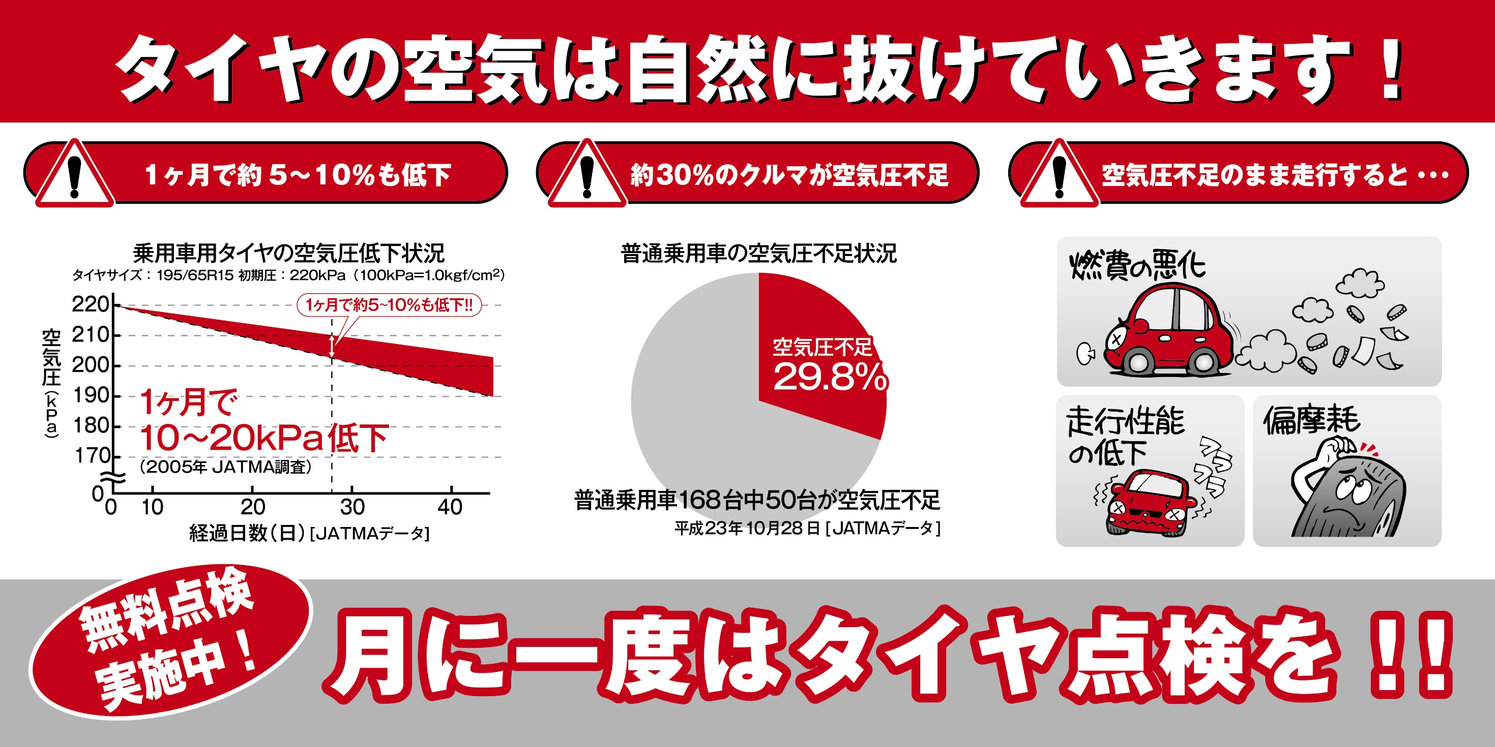 タイヤ館では無料でタイヤの空気圧を点検しておりますので。