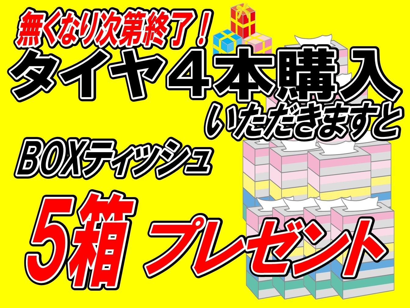 只今、タイヤ4本ご購入いただきますとBOXティッシュ5箱プレゼント!