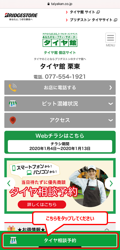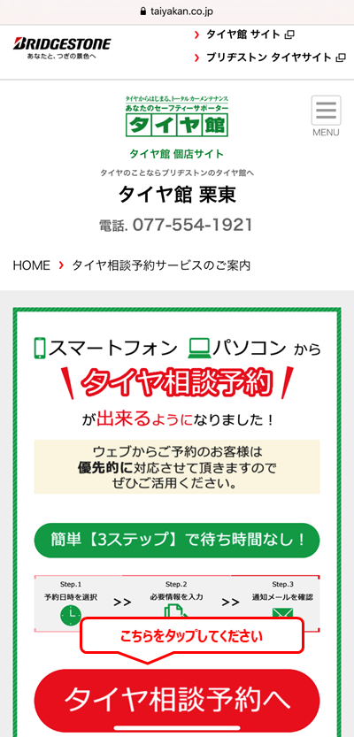 タイヤ相談予約というボタンをタップしてください。