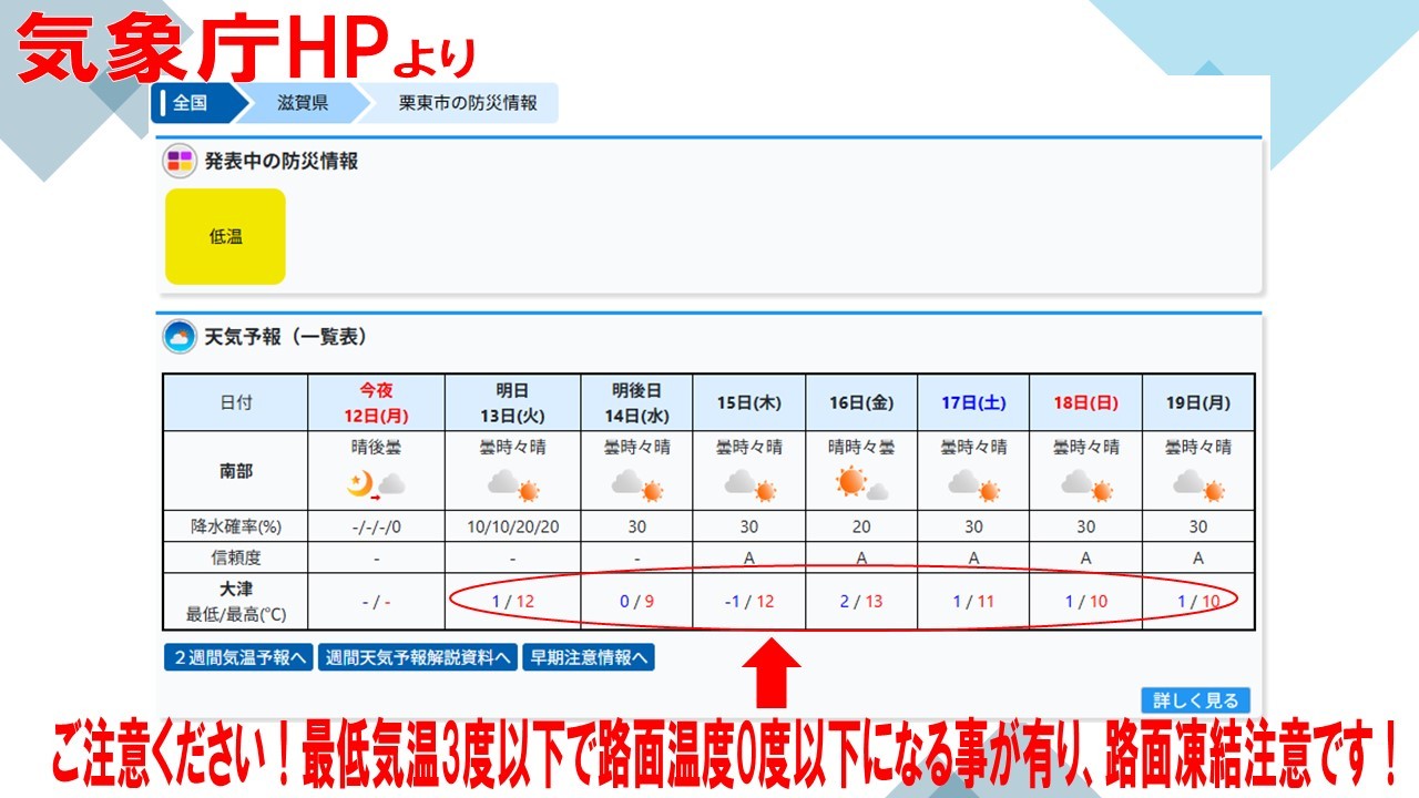 いつもタイヤ館栗東をご利用頂き ありがとうございます。 2026年1月12日17時発表 気象庁HPによりますと・・・・ 最低気温が3度以下となる日がございます。 一般的に0℃以下になると水が氷になることは 皆さんご存知だと思います。 しかし、実は最低気温が3℃以下になると 路面の温度は0℃以下になる...