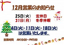 いつもタイヤ館栗東HPをご覧下さいましてありがとうございます! あっという間に12月にになりましたw(゚0゚*)w さて、12月の定休日はご覧の通りとなります☆彡 4日(火)・11日(火)・18日(火)は 通常営業日となります! 今年最後の月もタイヤ館栗東を どうぞよろしくお願い致します(*^-^*)