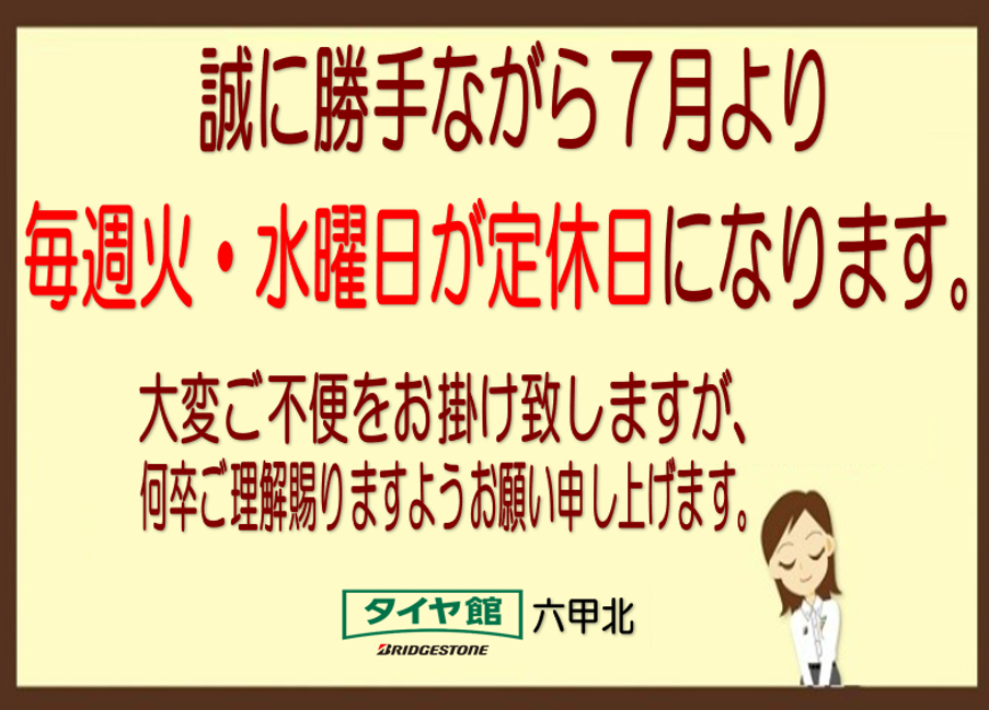 【重要】定休日変更のお知らせ 2025年6月12日 いつもタイヤ館六甲北店をご利用して頂き誠にありがとうございます。 2025年7月より、定休日が下記の様に変更となります。 変更前: 毎週 火曜日 変更後: 毎週 火曜、水曜の2日間 お客様方にはご不便をお掛けいたしますが、 ご理解、ご協力を宜しくお願い申し上げます。 今後ともタイヤ館六甲北店のご利用の程よろしくお願いいたします。