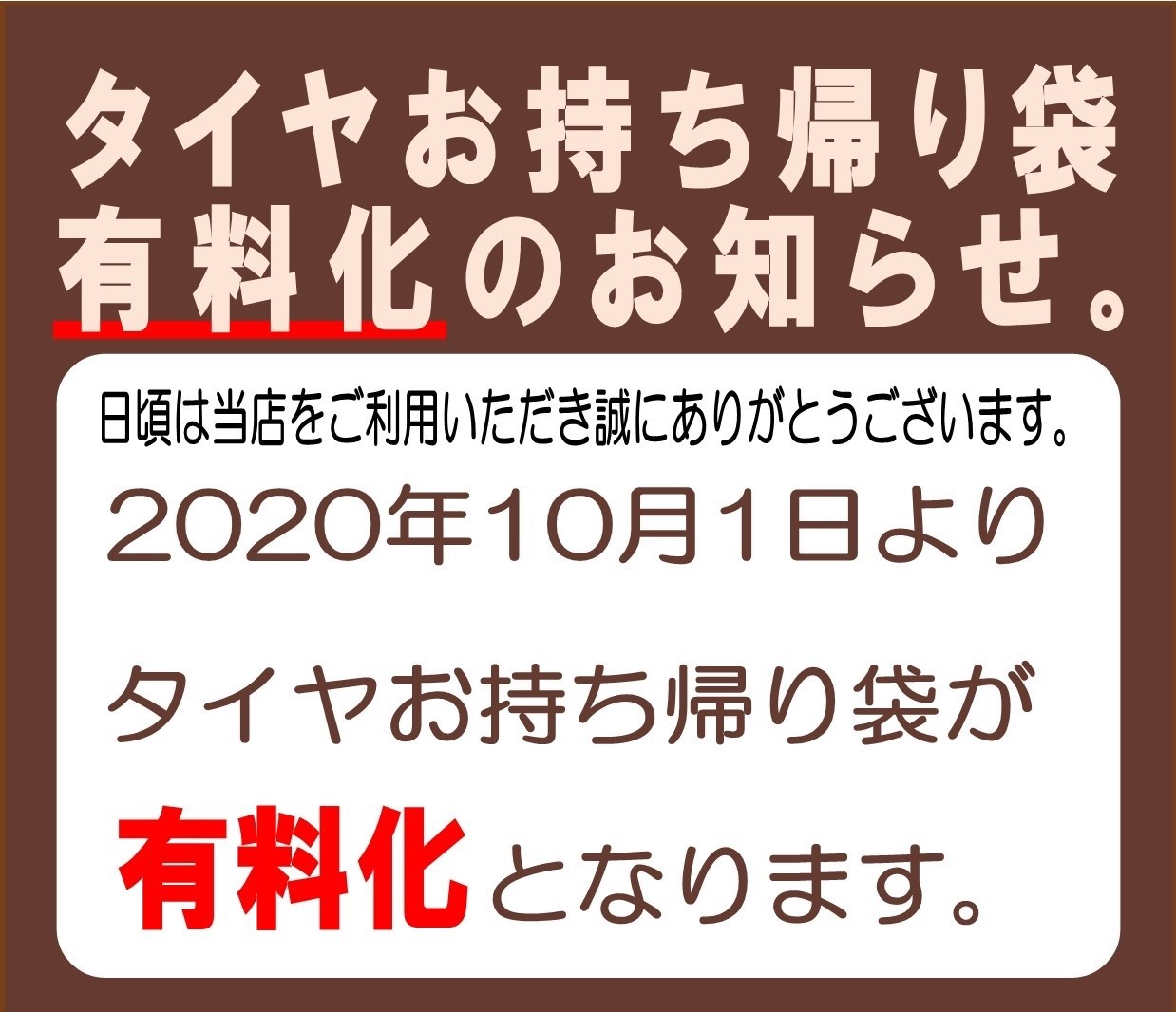 タイヤお持ち帰り袋が有料化 ポスト 2020年10月4日 西宮市山口町上山口にあるタイヤ専門店 タイヤ館 六甲北店です。 本日10月1日からタイヤお持ち帰り袋が有料化となりました。 ゴミの削減と環境保全のためにご理解とご協力を宜しくお願いします。