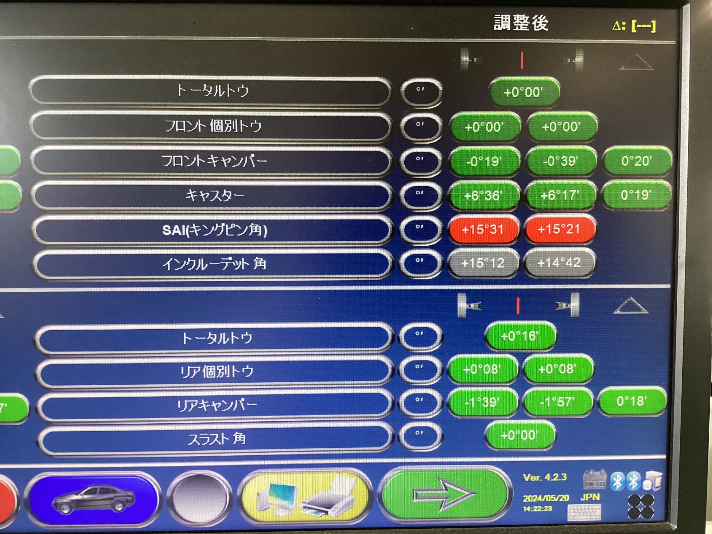 左前と右後のトー角が基準よりもズレています。(赤色表記の部分)