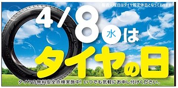 『タイヤの日創設』 タイヤ業界では、2000年に「4月8日タイヤの日」を創設しました。 春の全国交通安全運動が実施される4月、輪(タイヤ)のイメージから8をとり、4月8日をタイヤの日と定めたものです。 タイヤ館では入庫頂いたお客様へ無料のタイヤ点検を行っております! 最近タイヤの...