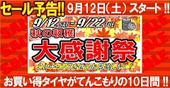 いよいよ始まりました!!! 9月12日(土)~9月22(火)の10日間ですが お買得タイヤを取り揃えてスタッフ一同心より ご来店をお待ちしています。 タイヤ館六甲北店は、西宮市山口町の 国道176線沿いコープさんの向かいにあります。 国道176号線をお通りの際にはお気軽に お立ち寄りください...