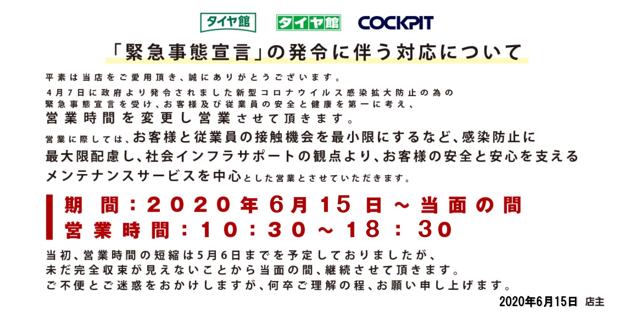 ■新型コロナウィルス感染拡大防止対策のご案内 平素はタイヤ館をご愛用頂き、誠にありがとうございます。 4月7日に政府より発令されました新型コロナウイルス感染拡大防止の為の 緊急事態宣言を受け、お客様及び従業員の安全と健康を第一に考え、 営業時間を一部変更させて頂きます。 【営業時間...