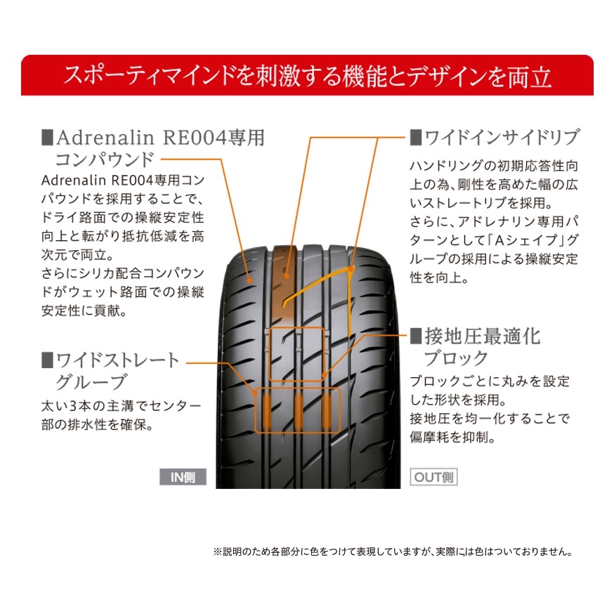 高性能を実現しつつ快適性にも配慮し、スポーティな走りを気軽に楽しめるカジュアルスポーツタイヤ「POTENZA Adrenalin RE004(ポテンザ アドレナリン・アールイー・ゼロ・ゼロ・フォー)」