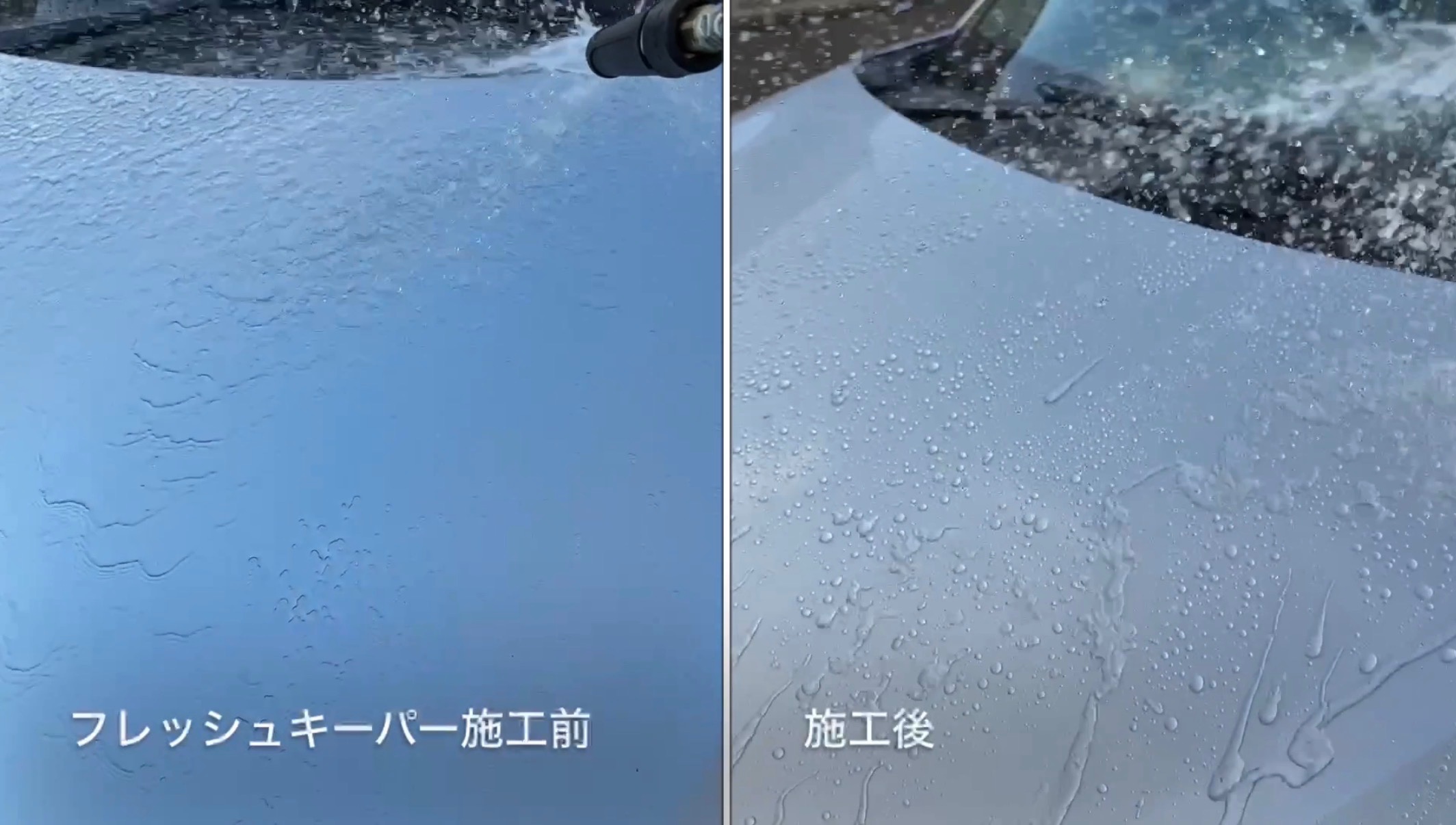 フレッシュキーパーは、汚れの密着を防ぐ独特な防汚能力を持ち、ホコリが降り積もっても塗装表面には密着せず、自然の雨が降れば元々持っている撥水力で、雨と一緒に汚れが流れ落ち、まるで洗車をしたかのようにキレイになります。