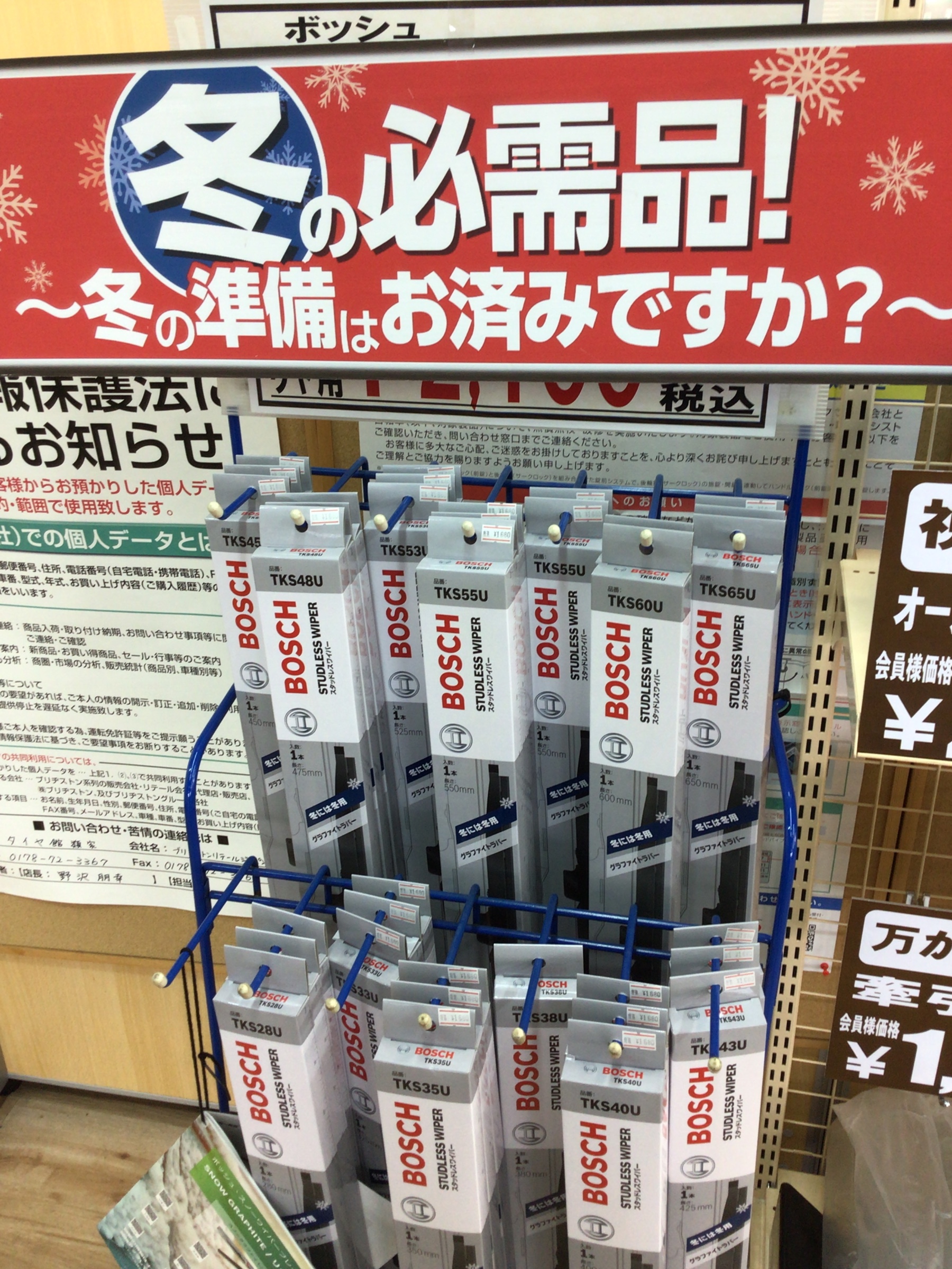 冬の必需品! その1 ポスト 2021年1月29日 まだまだ寒い日が続いてますが、冬に準備しておくと困らなくて済むアイテムを ご紹介したいと思います。 その1 冬ワイパー 冬ワイパーは準備している方も多いと思いますが、夏ワイパーのままだとゴムブレード自体が凍ってしまい降雪時に使い物にならなかったり、雪の重みで曲がってしまう可能性もあります。 なので、冬には冬ワイパーが必要です。 クルマによって長さが違いますので、分からない時はスタッフまでお問い合わせ下さい。 担当:川村
