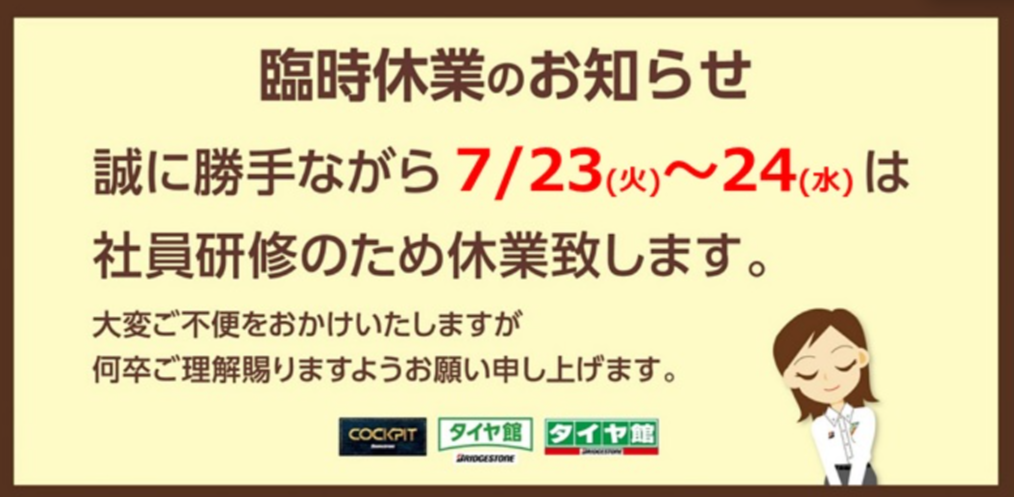 7月24日は社内研修の為、店舗休業です。 ポスト 2024年7月18日 こんにちは♪ いつもタイヤ館類家のホームページをご覧いただき ありがとうございます(*‘ω‘ *) 店舗休業のお知らせをいたします。 7/25(木)より通常営業です。 お間違いのないよう、お願いいたします。 担当:剣吉