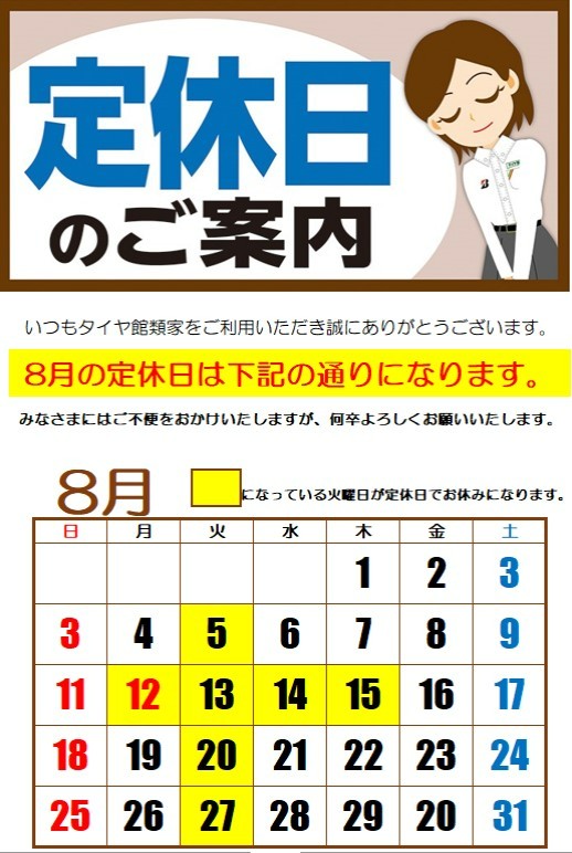 8月定休日のお知らせ