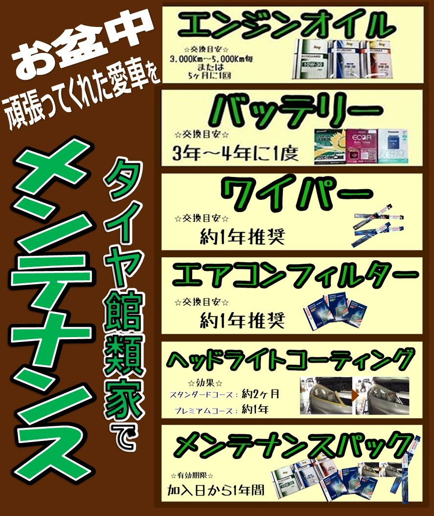 お盆中の挨拶回りや、お墓参りまたは、実家帰省などで長距離運転…などなどで頑張ってくれた愛車のメンテナンスしませんか?