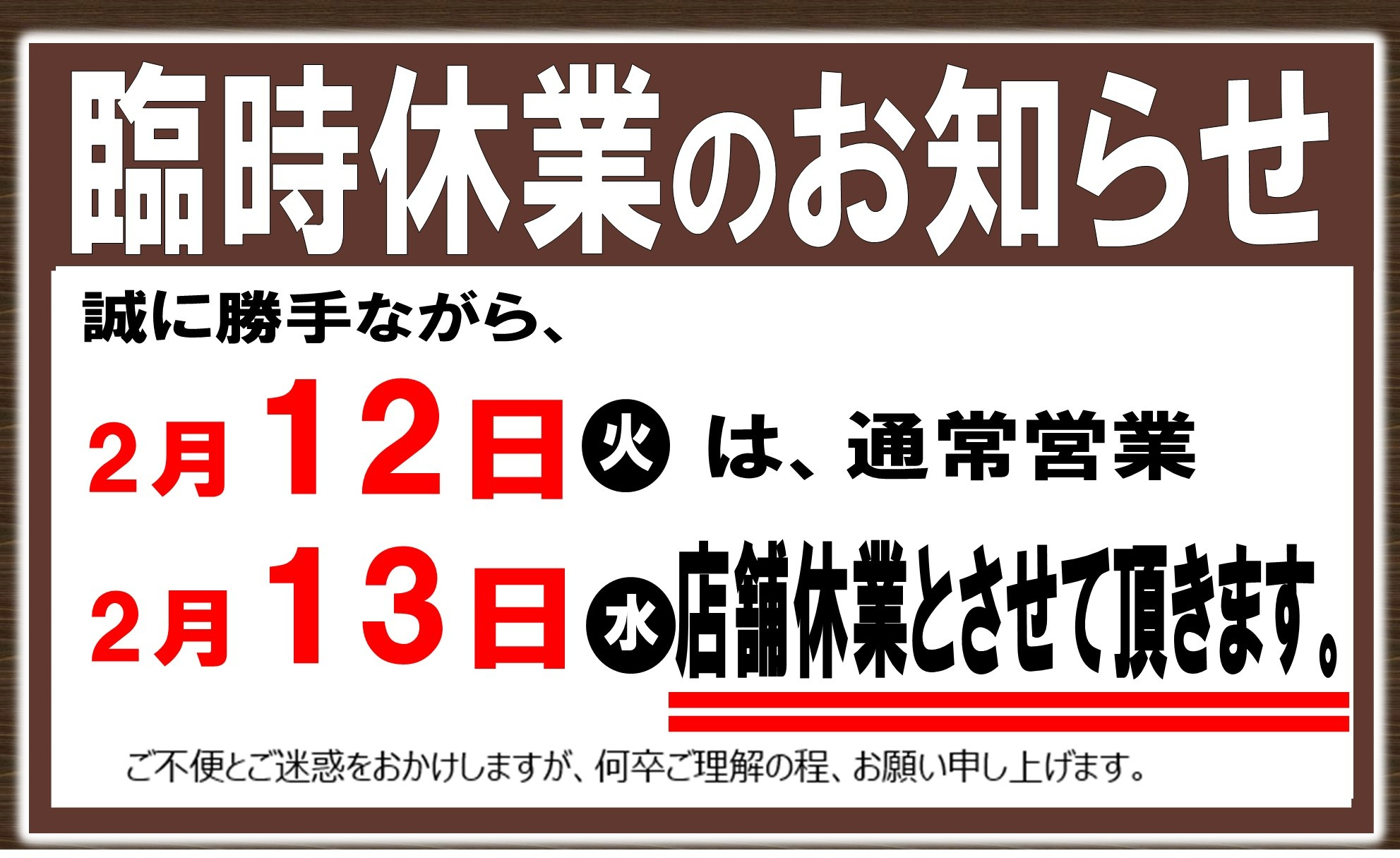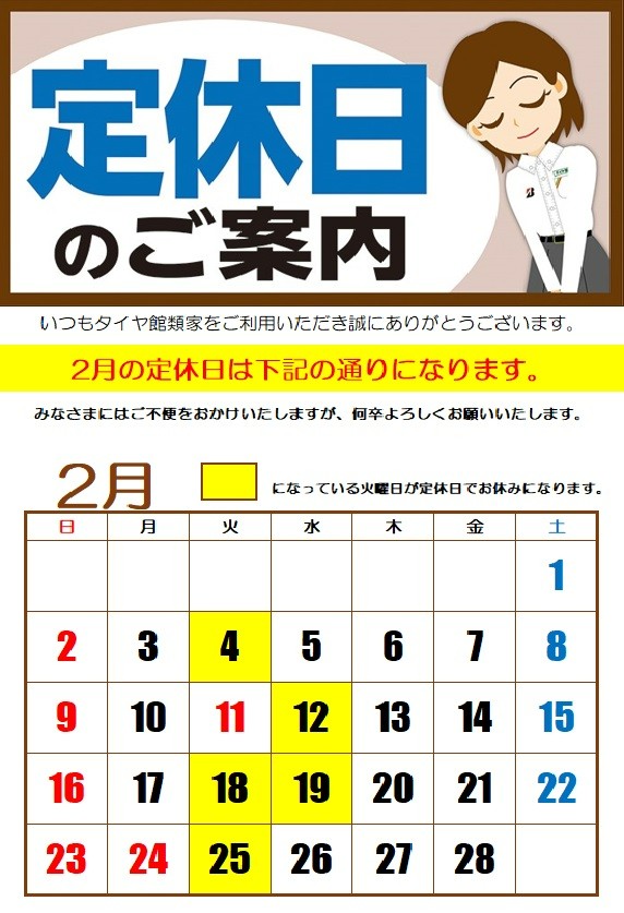 2月の定休日のお知らせ
