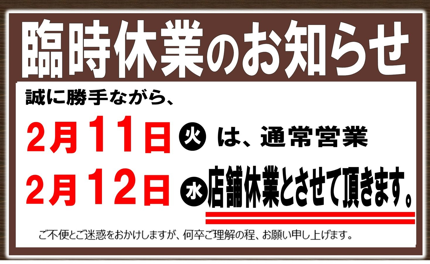 2月12日(水)は臨時休業