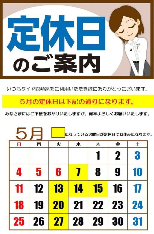 5月定休日のお知らせ