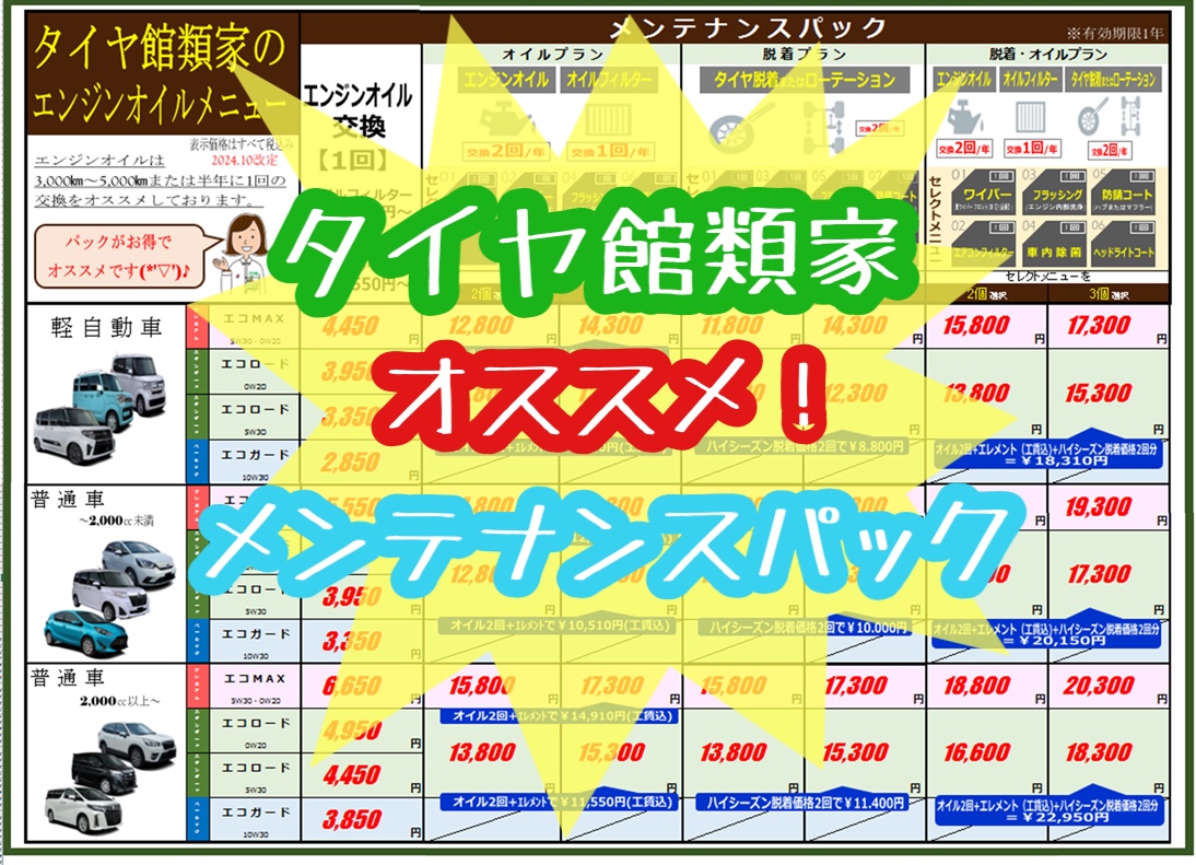 タイヤ交換、エンジンオイル交換はタイヤ館類家にお任せ下さい!