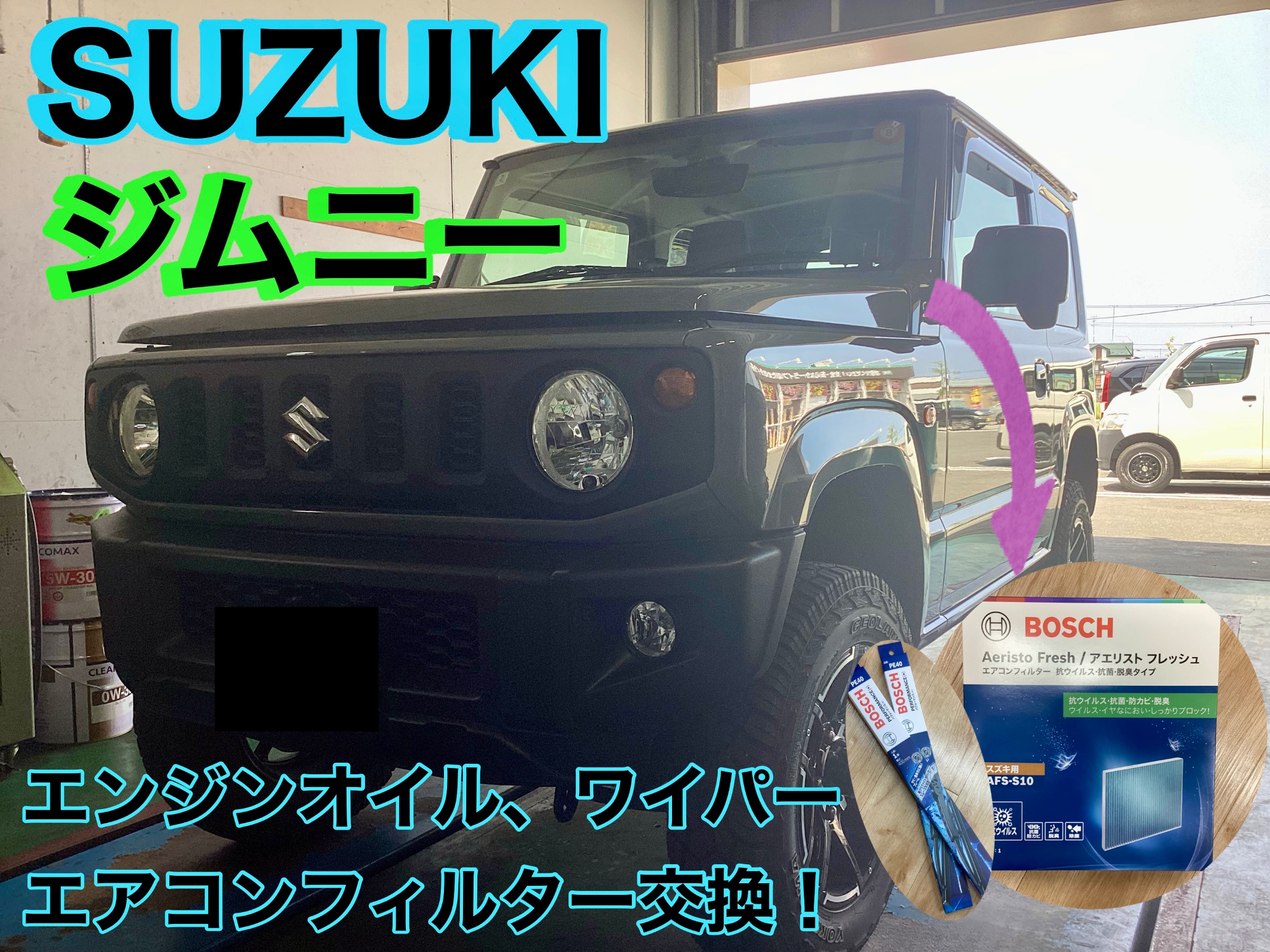 【SUZUKI ジムニー】エンジンオイル、エアコンフィルター、ワイパー交換!