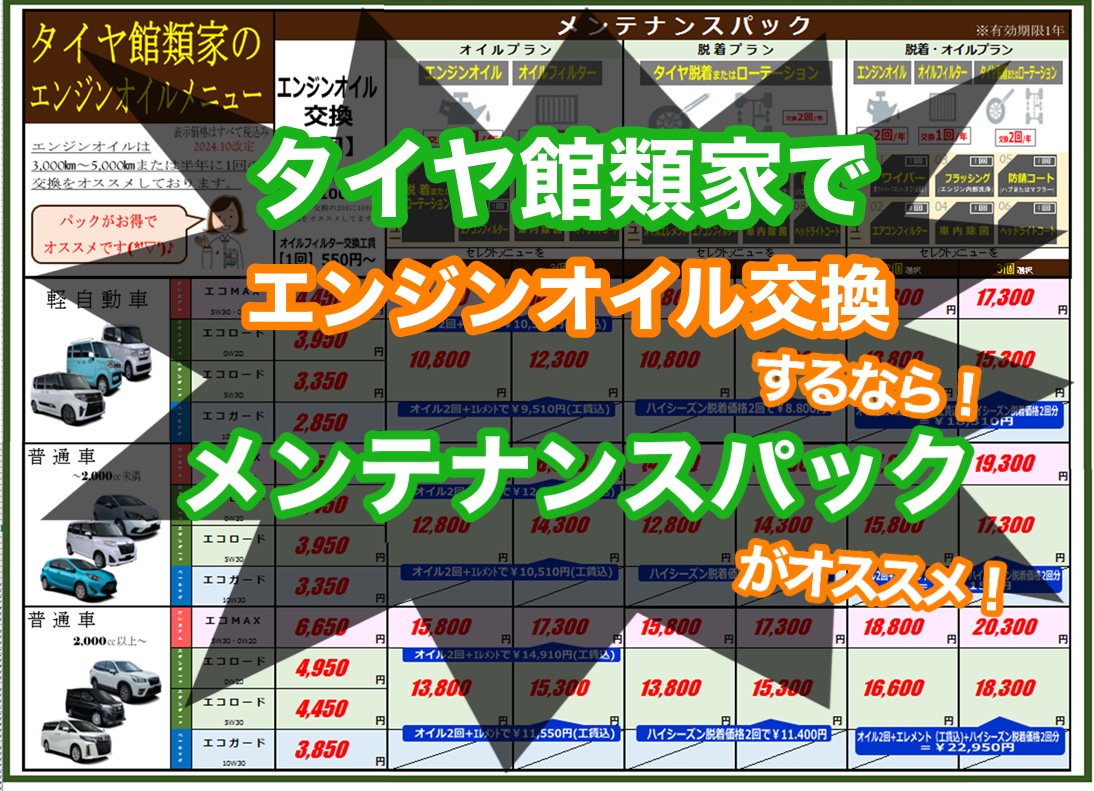 タイヤ館類家でエンジンオイル交換でしたらメンテナンスパックがオススメです!