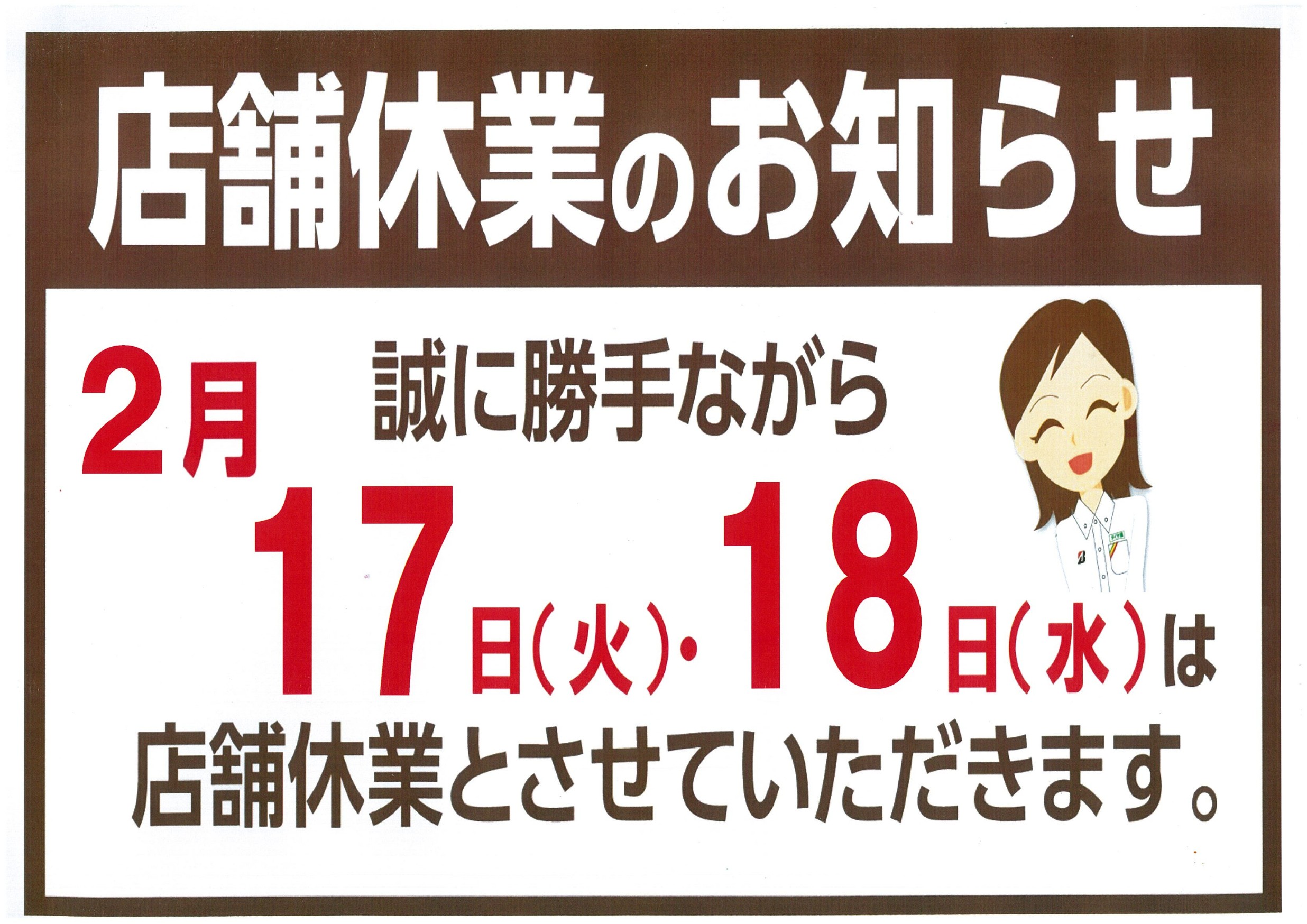 タイヤ館類家は2月17日、18日は店舗休業しております。