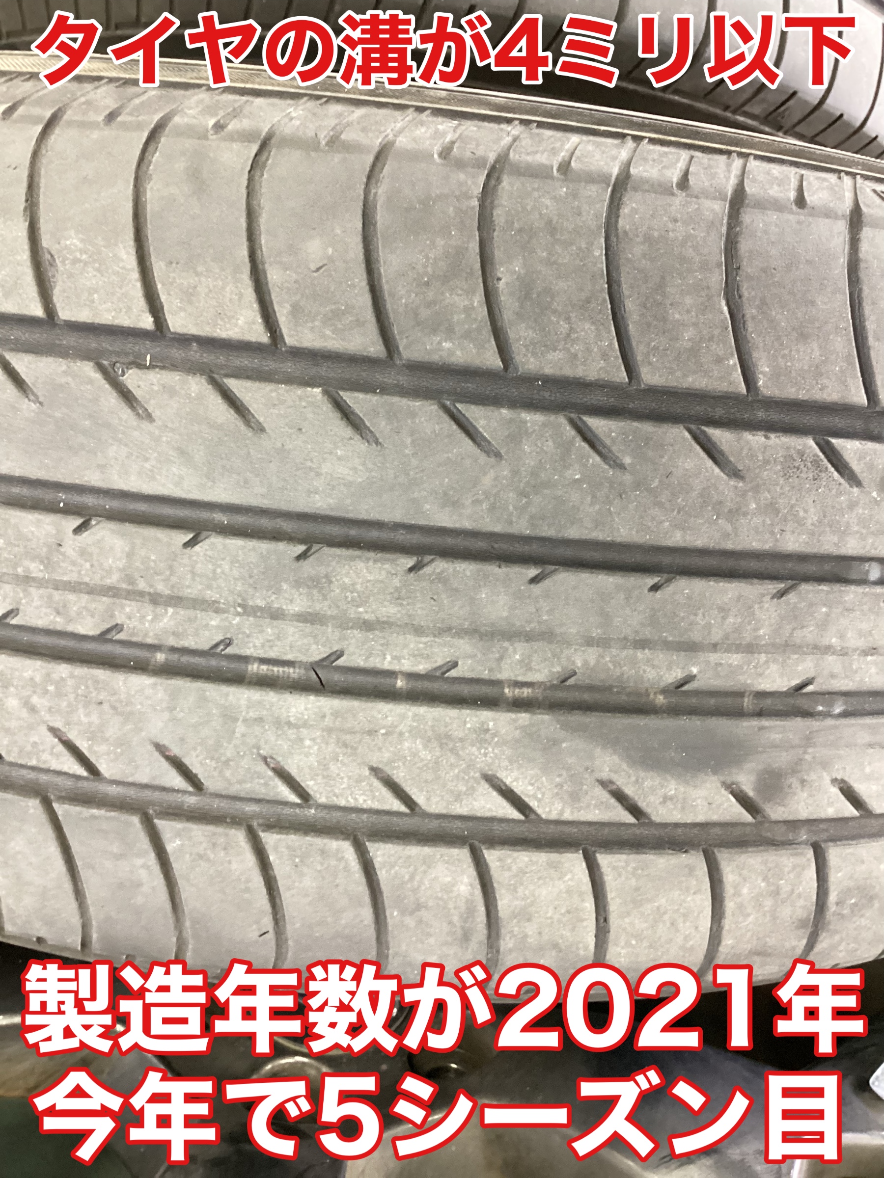 タイヤの残りの溝が4ミリ以下で接地面に細かいヒビも少し出ていました。