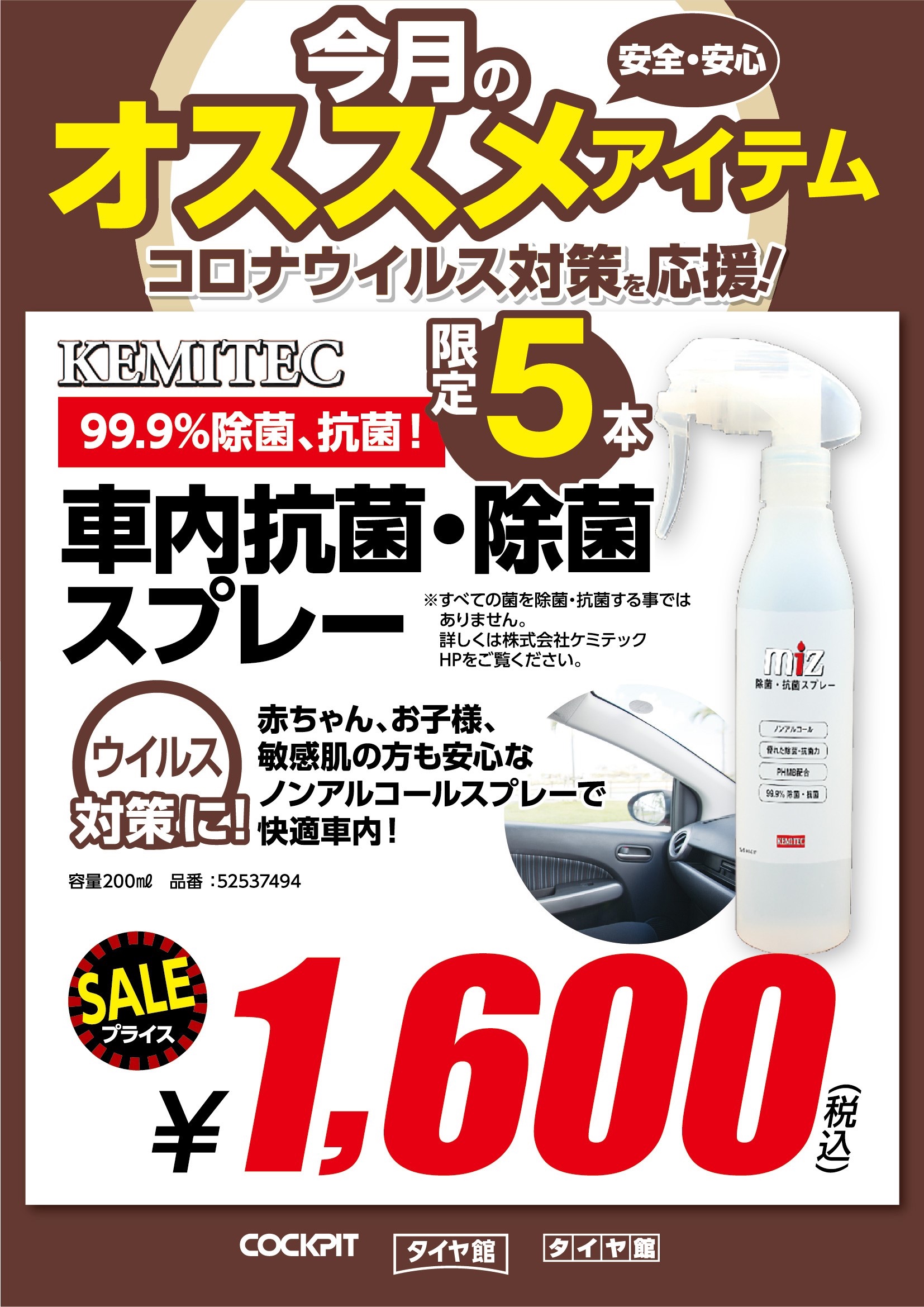 5月のおすすめアイテム① ポスト 2020年5月2日 皆さんこんにちは( ^∀^) タイヤ館類家トザワです。 5月になりましたので、おすすめアイテムのご紹介です♫ 今月はこちら!!! ケミテックの車内除菌・抗菌スプレーです! ノンアルコールなので、小さなお子様がいる方でもお使い頂けます。 レジ前で販売しております! 綺麗な車内で快適なカーライフを実現しましょう♪
