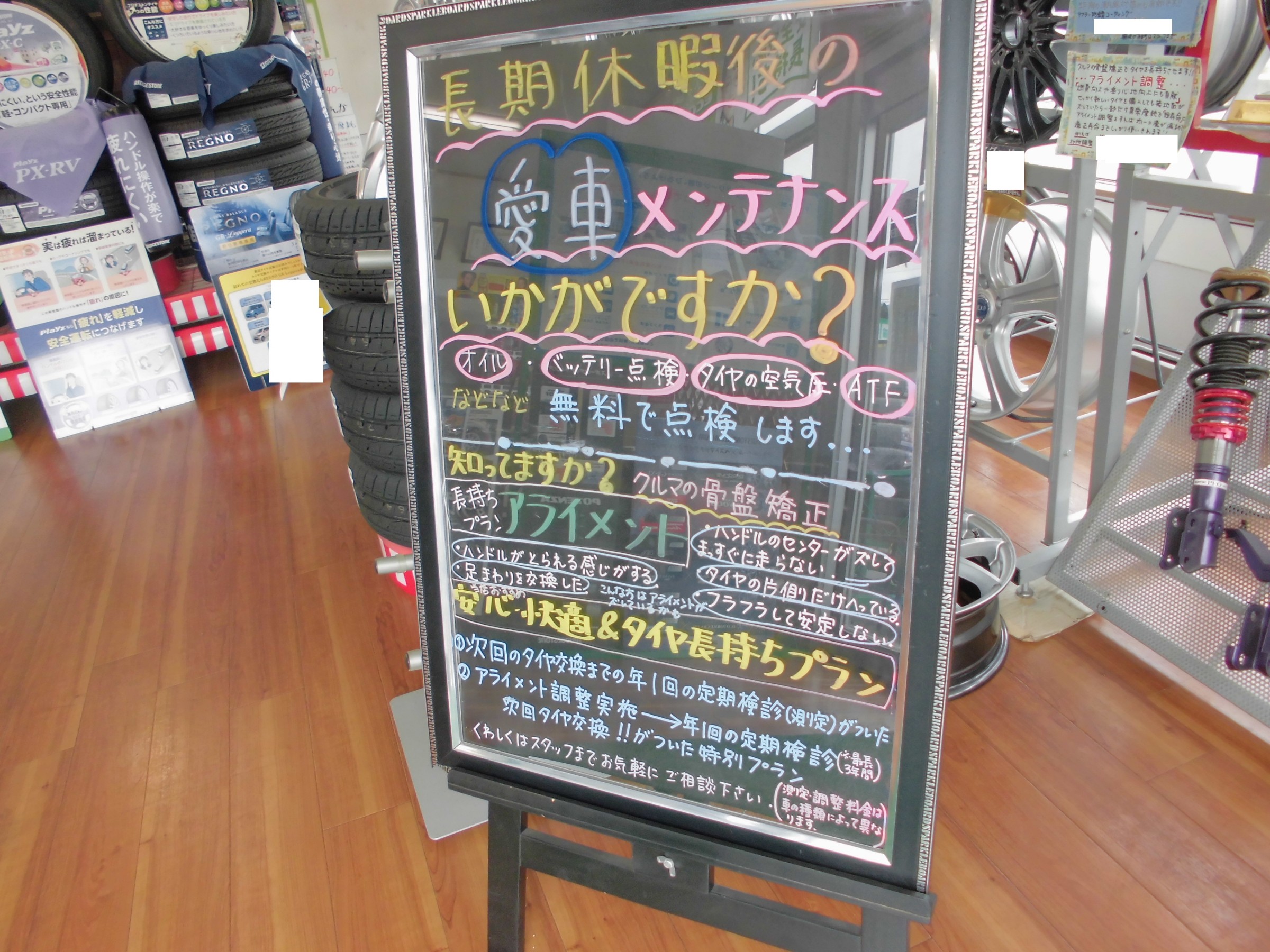 メンテナンスキャンペーン ポスト 2018年5月8日 こんにちは♪♪タイヤ館竜王です。 只今当店では長期休暇後の愛車メンテナンスキャンペーンを実施中!! オイル・バッテリー点検・タイヤの空気圧・ATF・などなど 無料で点検します。 この機会にぜひ点検しませんか? スタッフ一同皆様のご来店お待ちしてます。