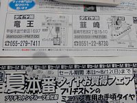 一昨日からのタイヤお買得フェアに台風の影響で雨、風が強い中でも ご来店頂きありがとうございました フェアは8月12日まで開催中でお買得商品もまだまだ多数 ありますのでご来店おまちしています。 同時に甲斐市夏の大感謝祭に協賛しているのでくじ引きを やてえいます