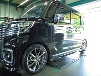 こんにちは 今日はスペーシアカスタムMK53の4WDに 車高調取付しました。 4WDなので程よく下がって雰囲気変わりました
