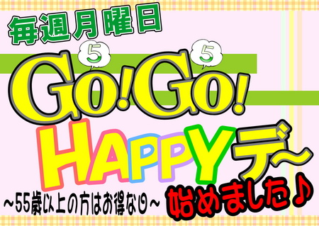 Go!Go!ハッピーディ ポスト 毎週月曜日はGo!Go!ハッピーディです!! 55歳以上の方にお得な日です!! 会員制ですので 詳しくはスタッフにおたずねください(^o^)丿 (入会料は無料です。) また、偶数月にはGO!GO!ハッピーディがまるごと1週間に変身する【Go!Go!ハッピーウィーク】を開催しています♪ カテゴリ:商品情報 その他商品・サービス