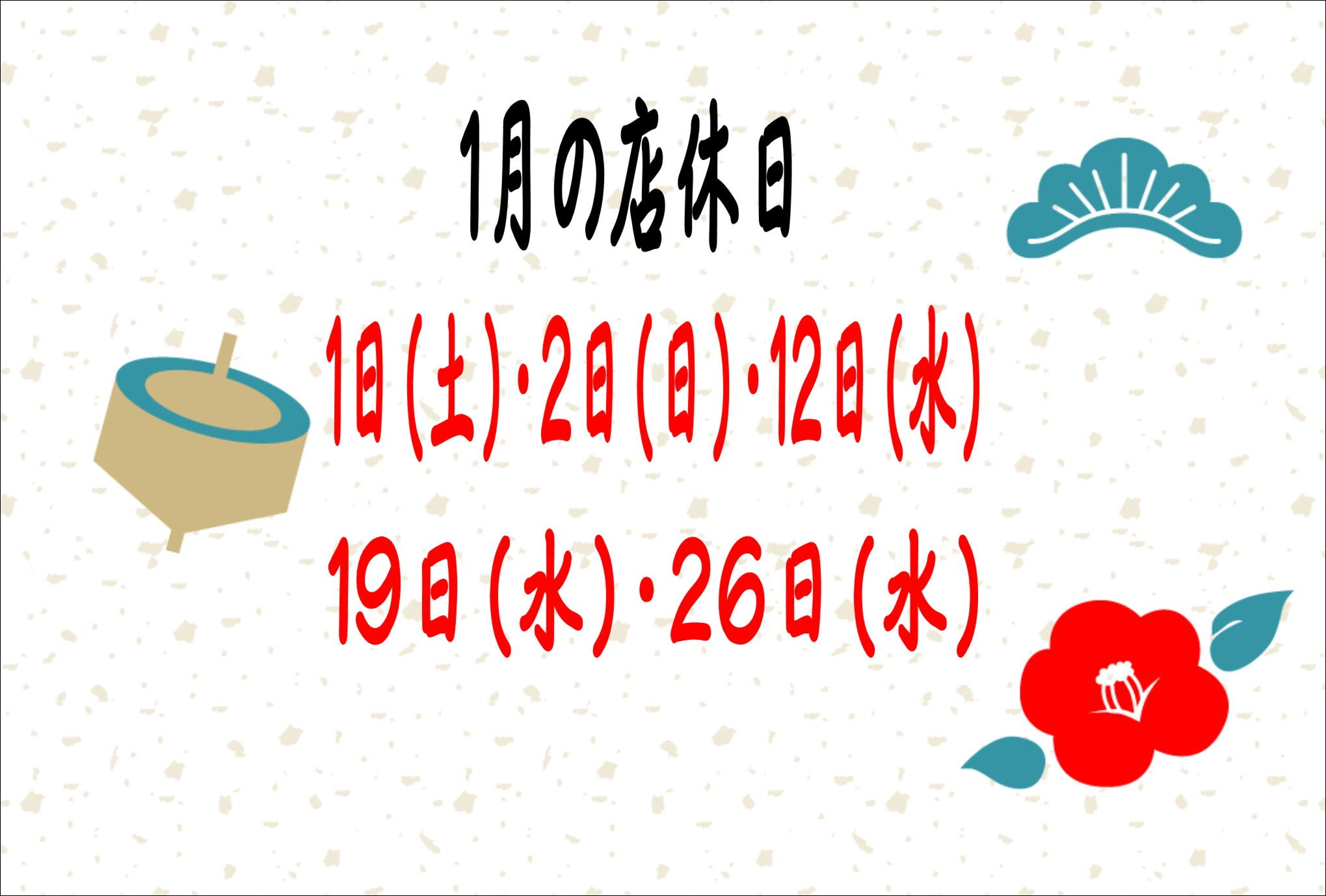 2022年1月の店休日のお知らせ ポスト 2021年12月27日 こんにちは! 2021年も残すところあとわずか・・・。 1年があっという間に過ぎていきますね(*'▽') さて、来年2022年1月の店休日のお知らせです。 1月1日(土)・1月2日(日)・1月12日(水) 1月19日(水)・1月26日(水)となります。 カテゴリ:お知らせ