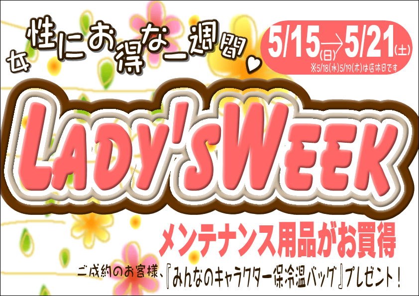 5月はレディースウィーク☆ ポスト 2022年5月8日 ★☆5月のイベント情報☆★ 『女性が嬉しいレディースウィーク』 オイル、メンテナンス用品(ワイパー・バッテリー・エアコンフィルターなど) 店頭価格より10㌫お得にお買い物できます!(^^)! 開催期間:5月15日から5月21日 期間中の5月18日(水)・19日(木)は店休日です。 カテゴリ:お知らせ