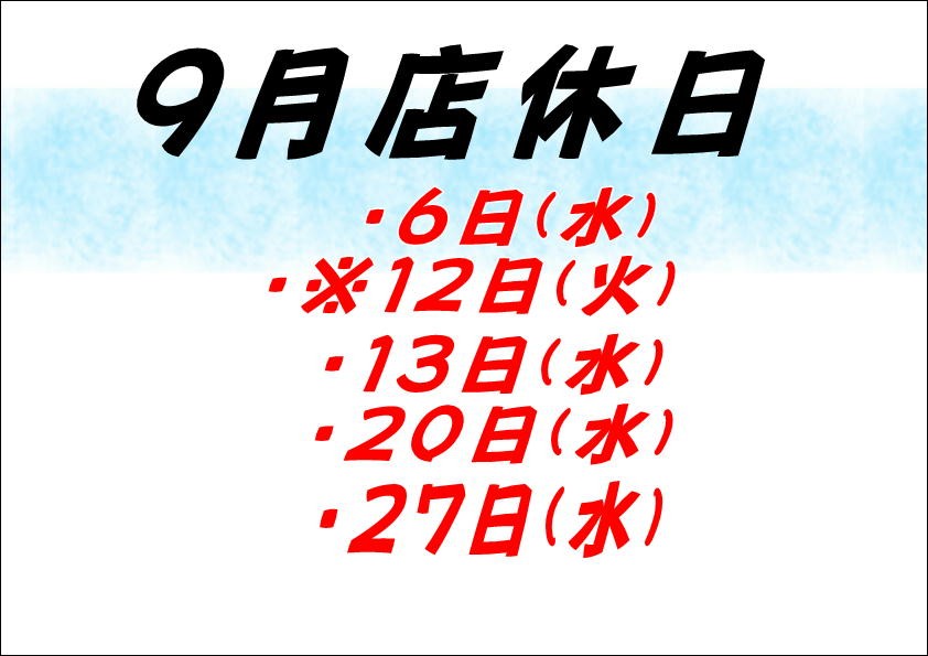 9月の店休日のお知らせです。 ポスト 2023年8月28日 9月の店休日のお知らせです。 6日(水)・※12日(火)・13日(水)・20日(水)・27日(水) となっております。 店休日が12日(火)・13日(水)と連休となっておりますので お間違えの無いようお気をつけてください。 カテゴリ:お知らせ