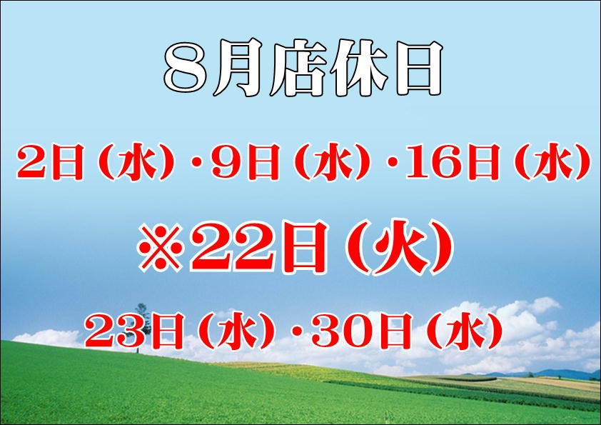 さて明日8月30日(水)は⇒店休日です。
