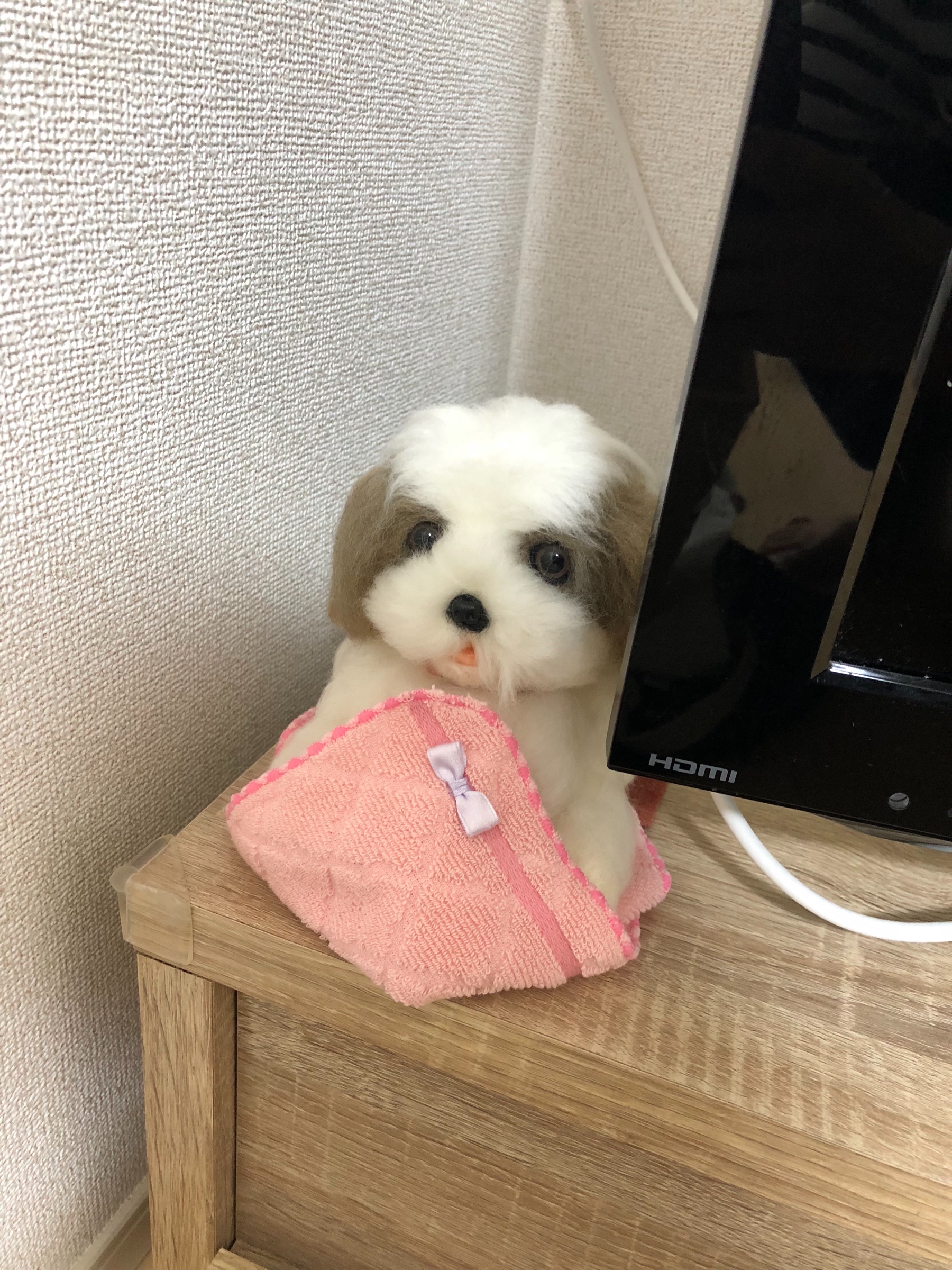 シーズーがテレビ横に待機。
