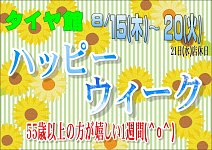 こんにちは! タイヤ館武雄店はましたです^^ 本日8月15日より20日まで 『~55歳以上の方が嬉しい1週間~』 ゴーゴーハッピーウィーク開催!!!!! オイルはもちろん、メンテナンス用品も 店頭価格より10パーセントお得になります。 この機会にタイヤ館武雄店へご来店いかがですか?