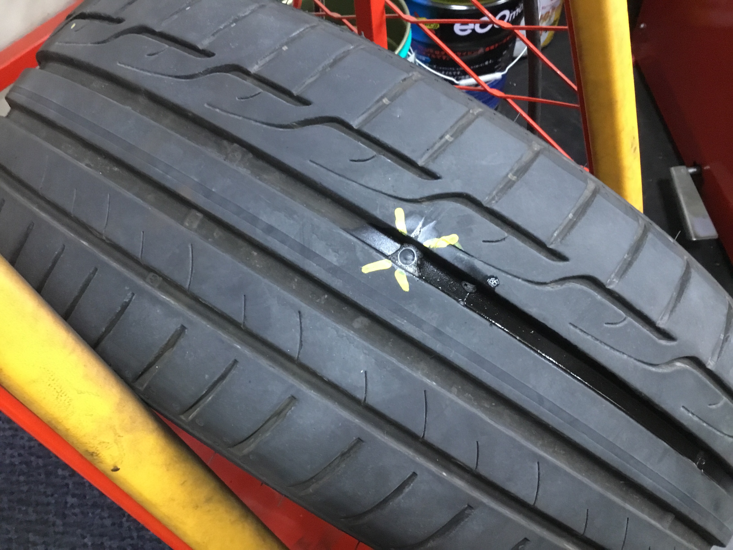 先日、タイヤ接地面にクギがささっていたためパンク修理の作業をさせていただきました!