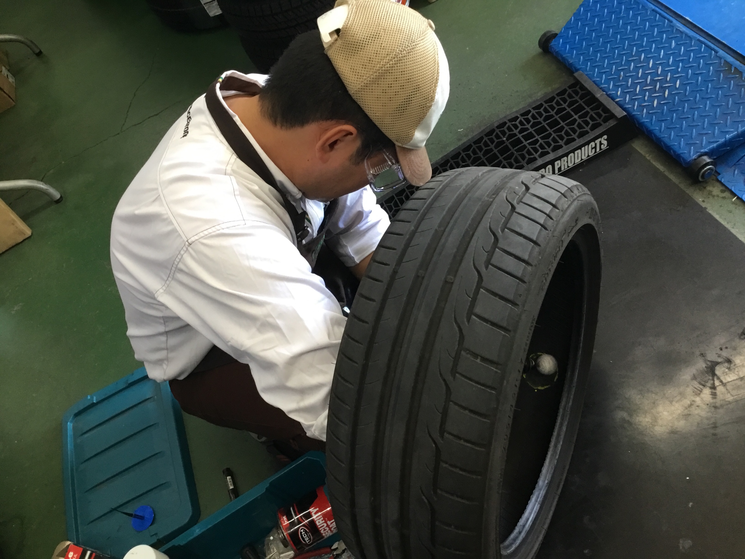 タイヤ内部の状態を確認後、修理可能なため、内側からしっかり空気をとめる