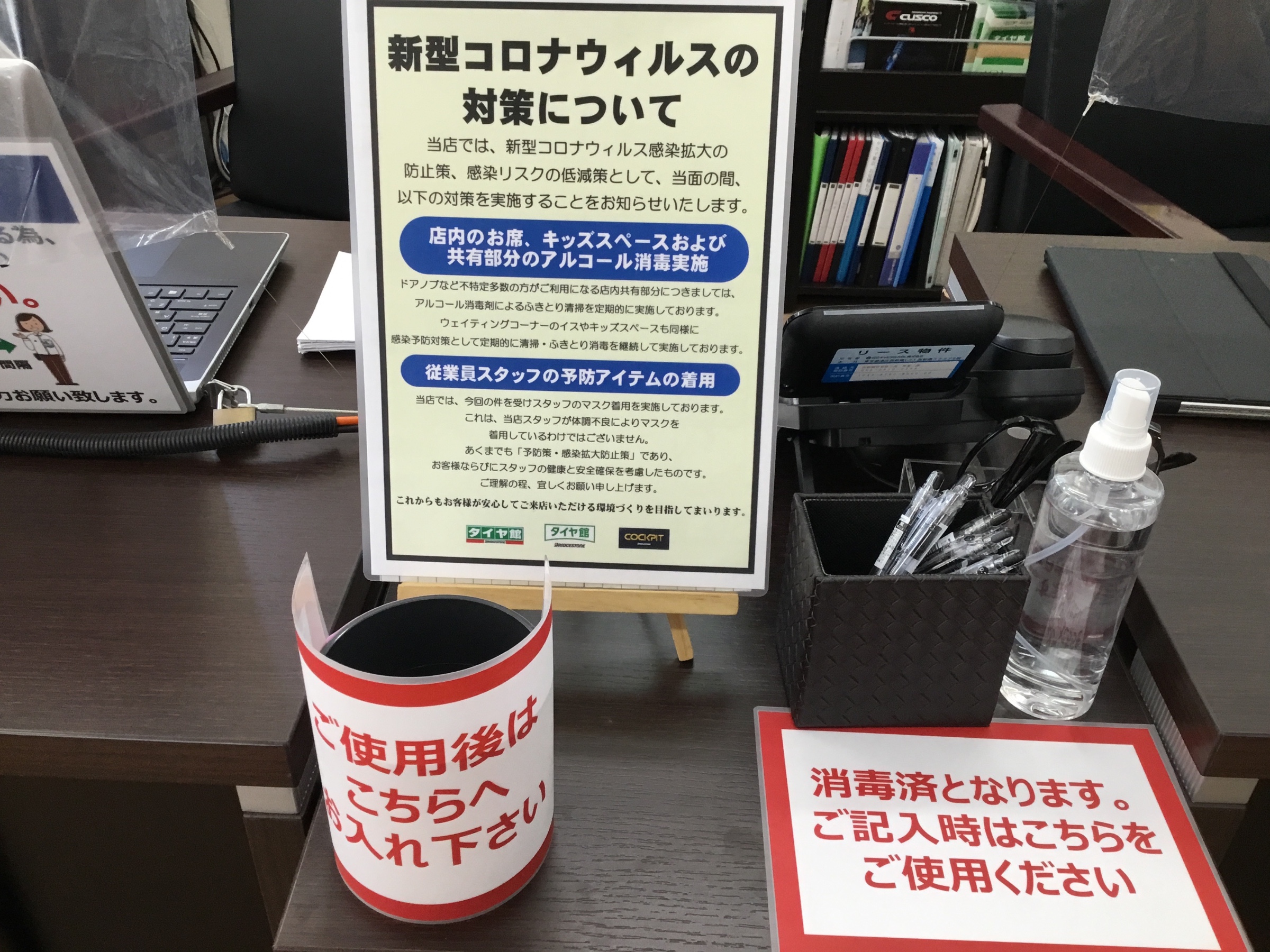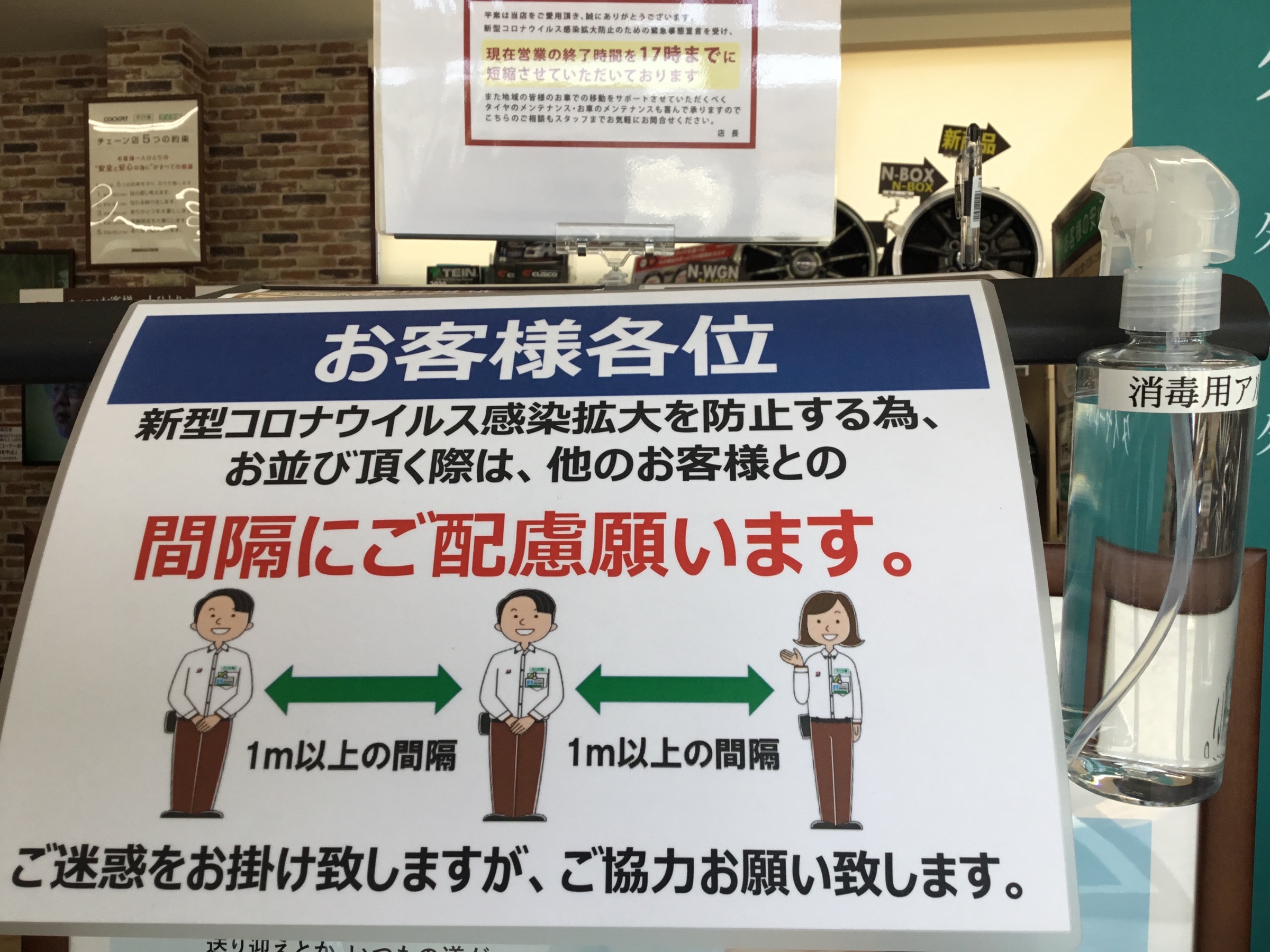 先ずは店内入口にアルコール除菌にて手の消毒をお願いします。