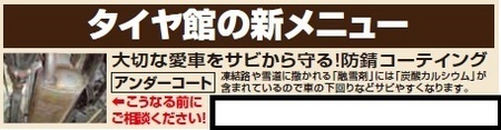 防錆はじめました☆『下回り防錆コート(塩カル防錆剤)』 ポスト お車のサビ対策してますか? んっ?何のことかな?と思いますよね! クルマの部品のほとんどは金属です。 当然「サビ」ます! この「サビ」がクルマの故障の原因になることもあること、ご存知でしたか? クルマが「サビ」てしまう原因はいくつかあります。 ①冬場、路面にまかれる融雪剤・凍結防止剤の付着 ②海沿いの走行・潮風 ③飛び石などで標準の防錆加工をはがれた など 相模原市・愛川町は①の融雪剤・凍結防止剤の付着が多い地域ですよね! 新車の方もマフラー換えた方も どんな方にもオススメです! 施工時間は30分程度です。 ぜひ一度、ご相談ください! カテゴリ:商品情報 その他商品・サービス
