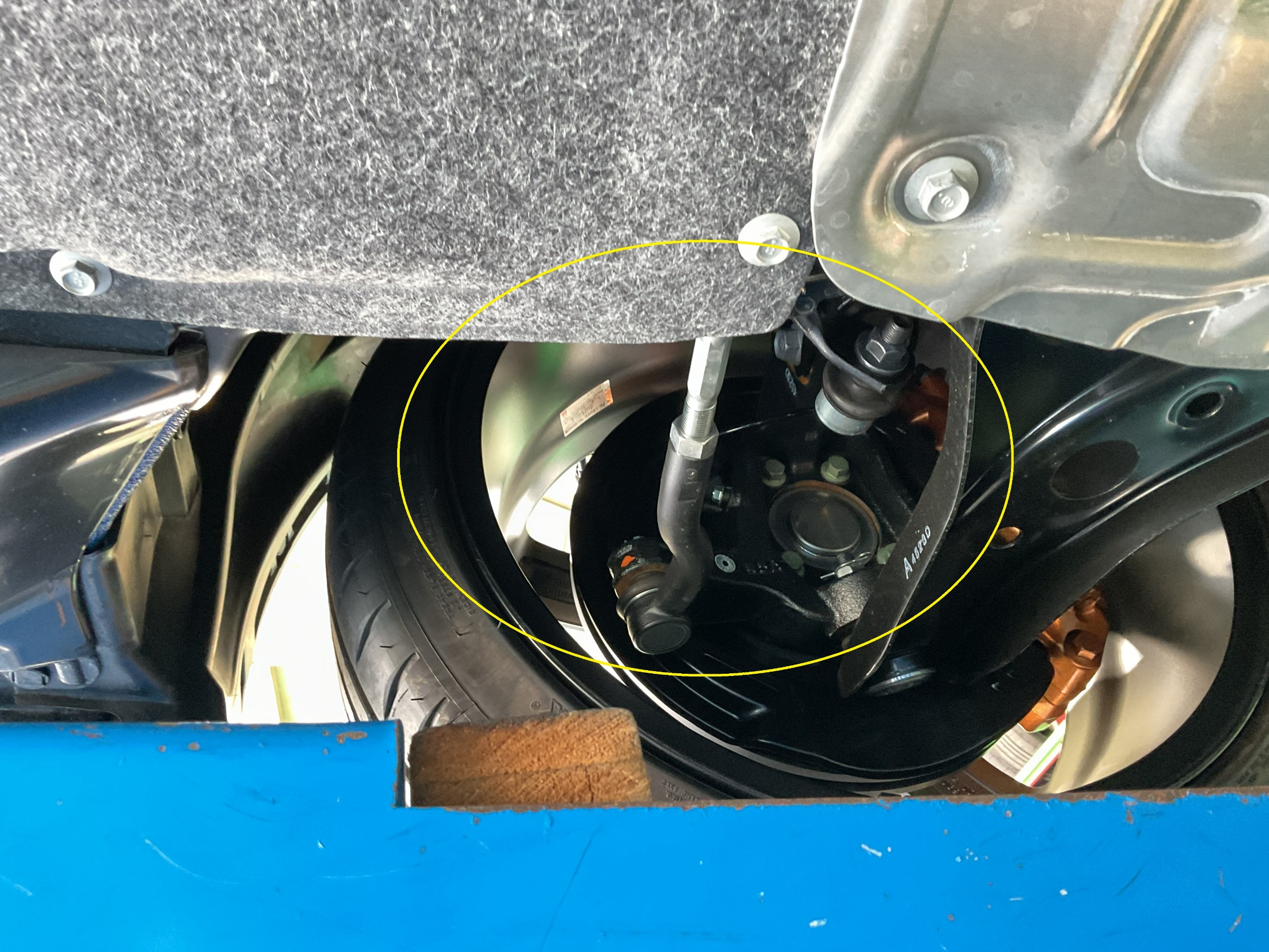 『タイロッド』と呼ばれる箇所にて調整していきます。(黄色〇印)
