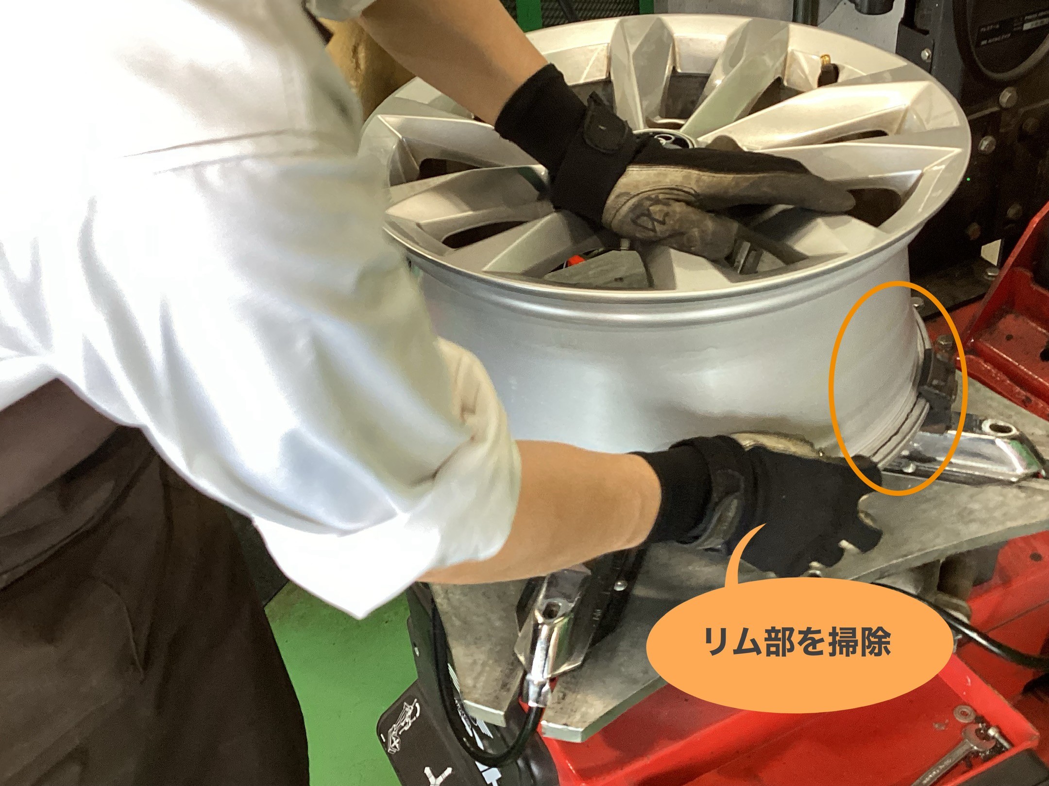 タイヤをホイールから外したのち、リム部の清掃を行います。