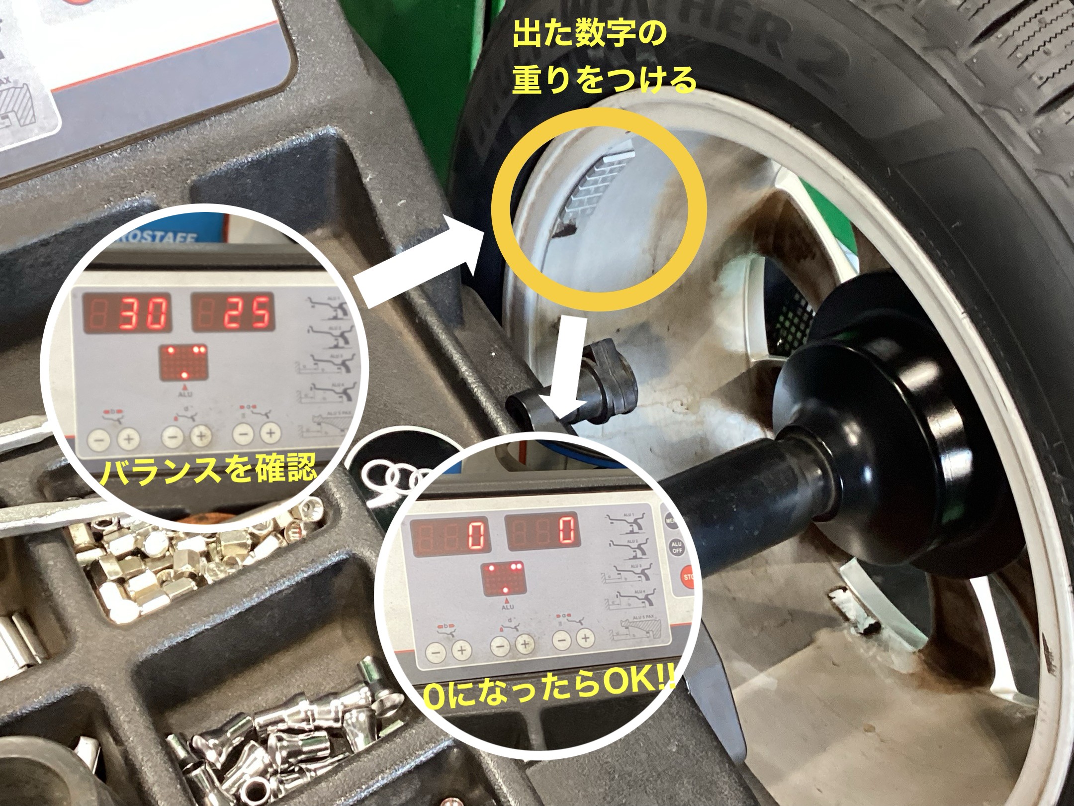 タイヤをホイールに組付けし、空気を入れたらバランスを確認していきます。