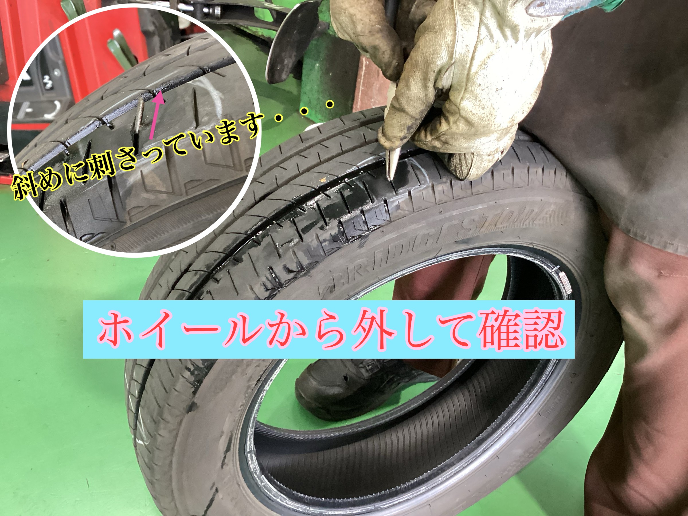 刺さっていた物が斜めだと外からも内からも修理が不可能なため、今回はタイヤ交換させていただきました。