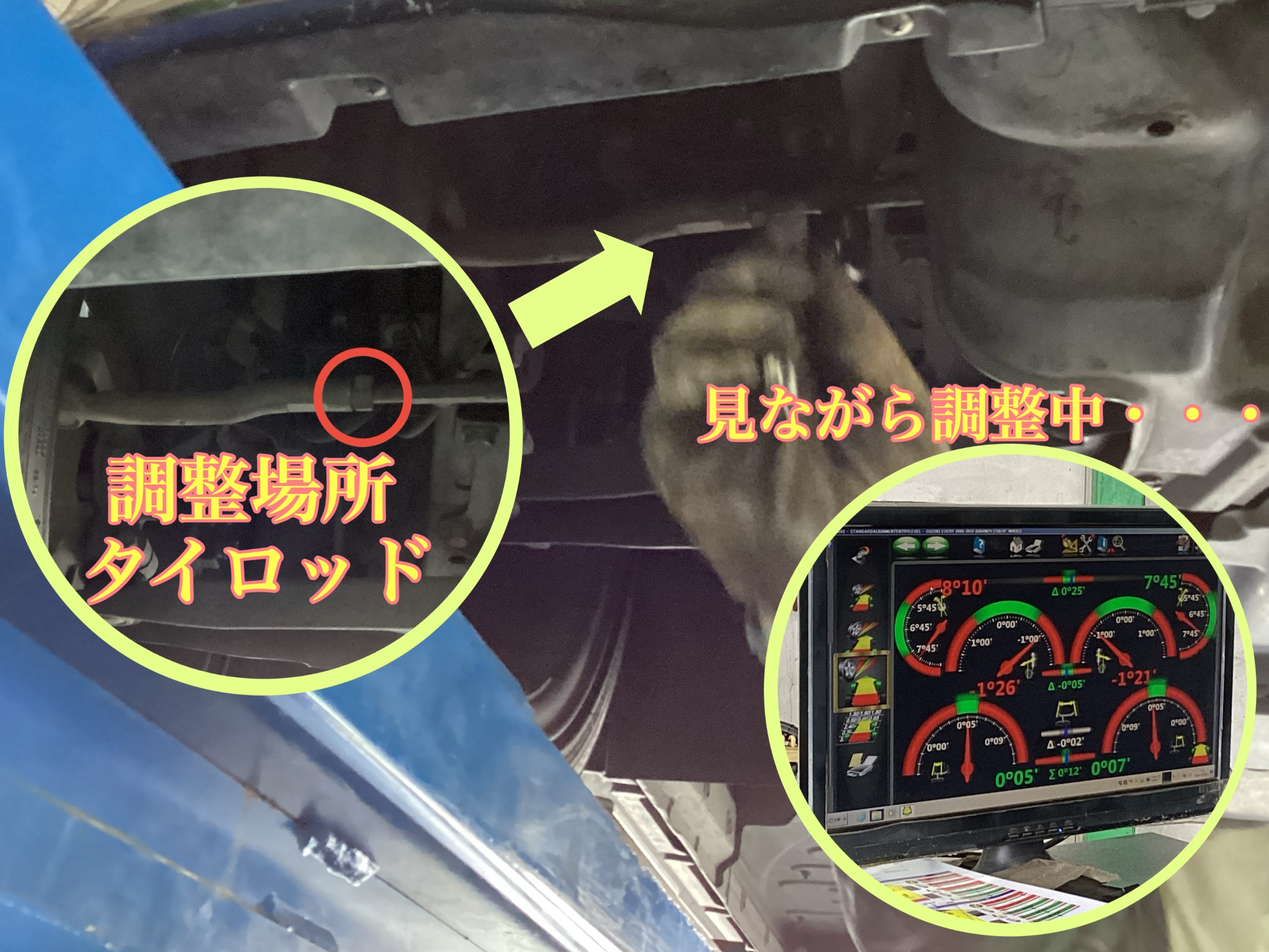 調整はタイロッドと言われる足回りにある部品を工具を使って行います。