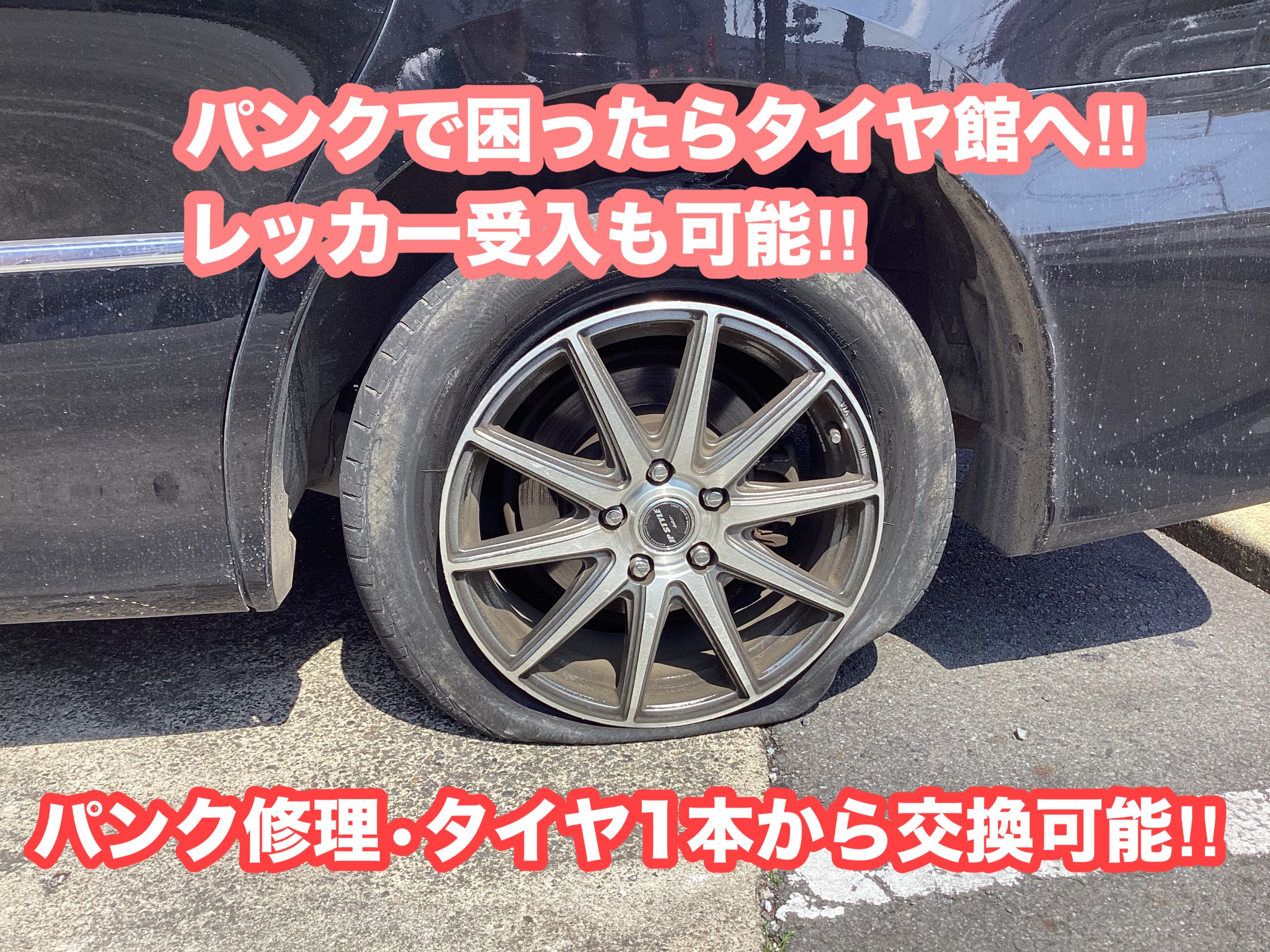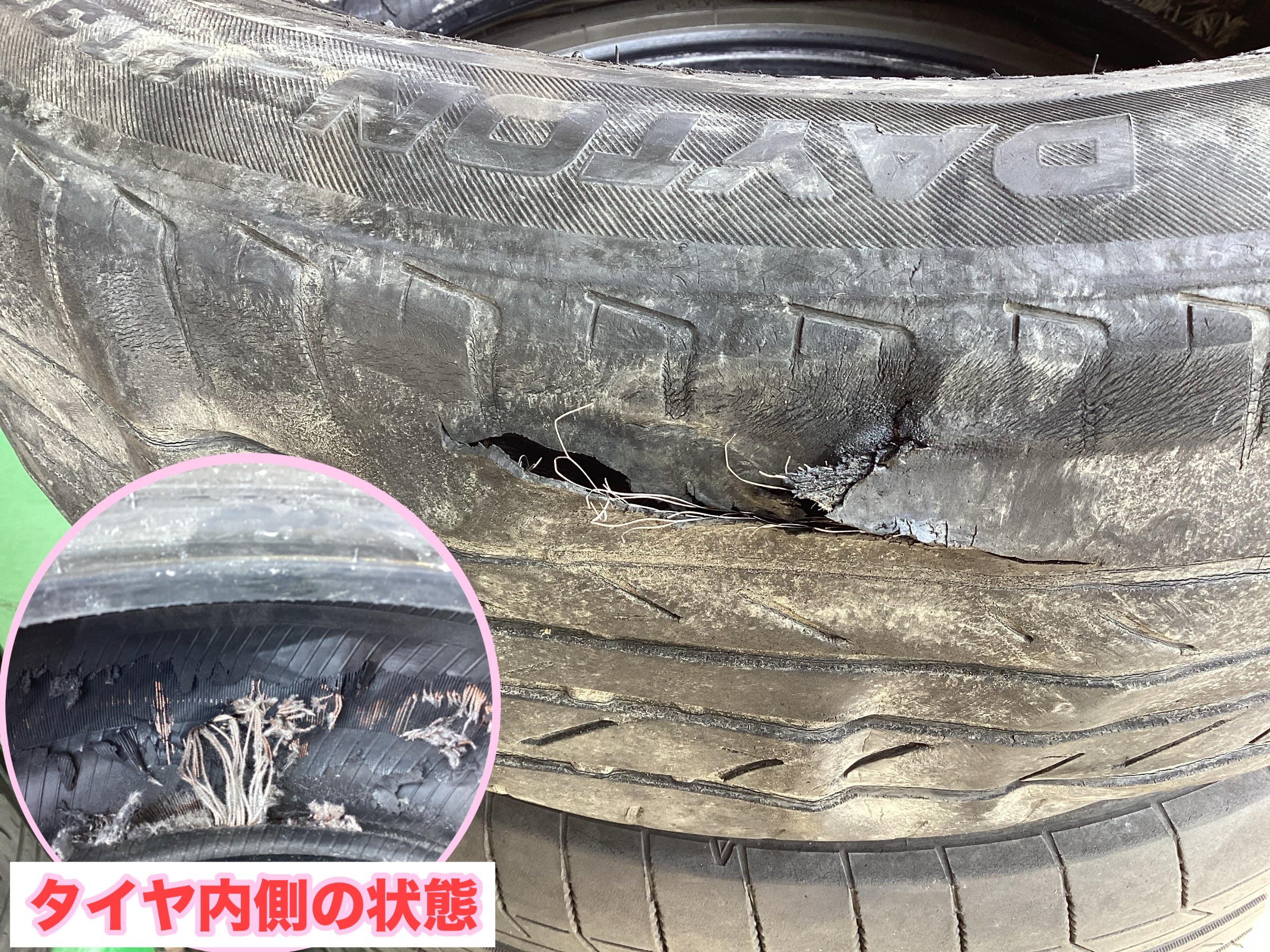 今回は、タイヤがバーストしてしまったお車のタイヤ点検・タイヤ交換を実施しました。