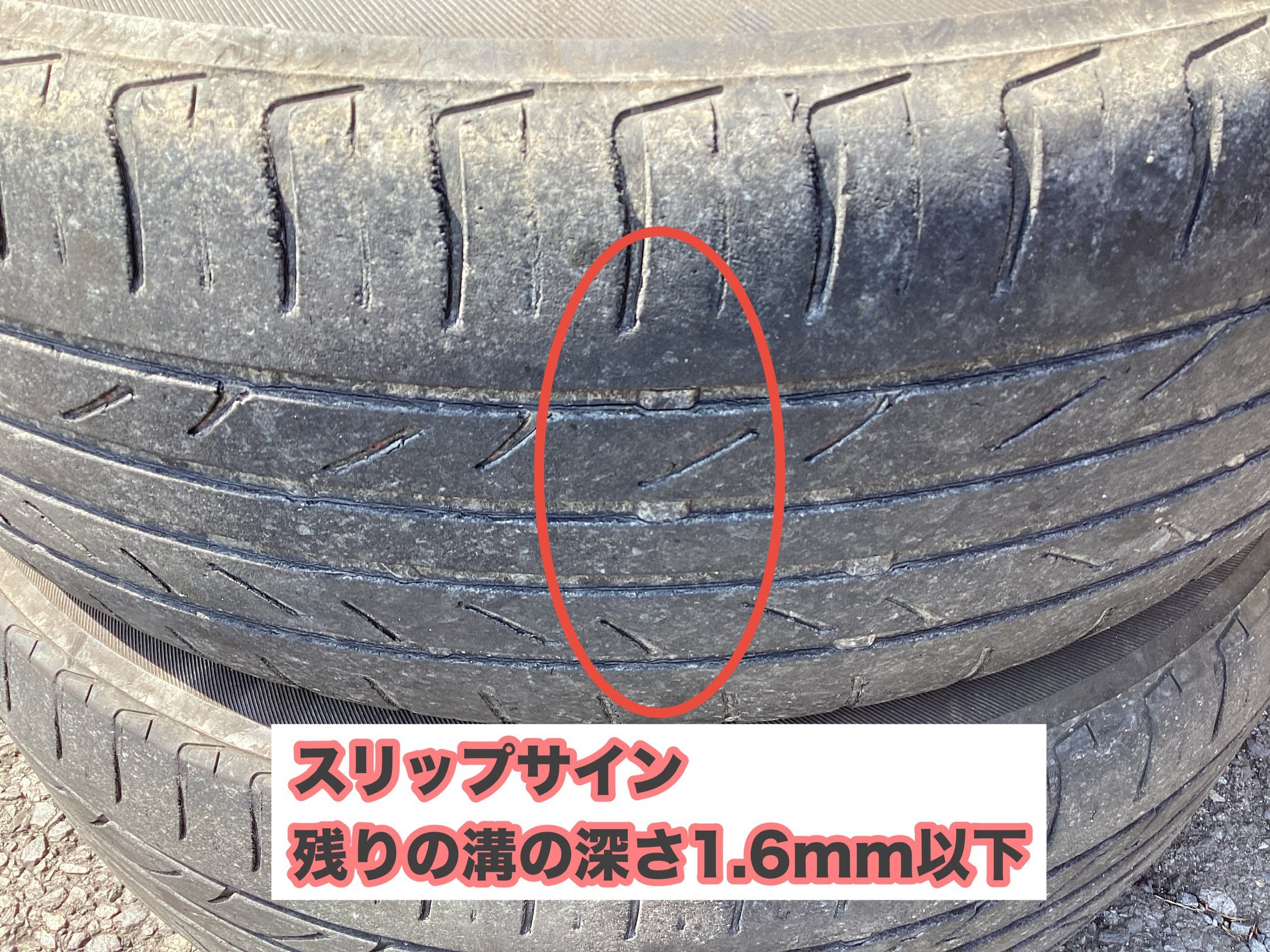 スリップサイン:タイヤの使用限界である残り溝の深さ1.6mmを示すサイン