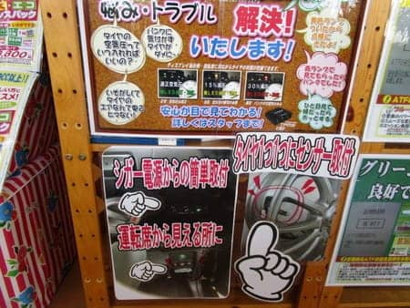 車内にシュガライターから電源を取りますので簡単に設置できますしタイヤの空気圧も一目で