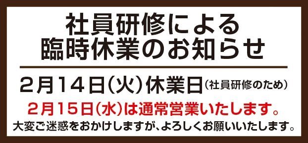 いつもお世話になっております、タイヤ館相模原店です。誠に勝手ながら、2月14日(火)は社員研修のため臨時休業とさせていただきます。